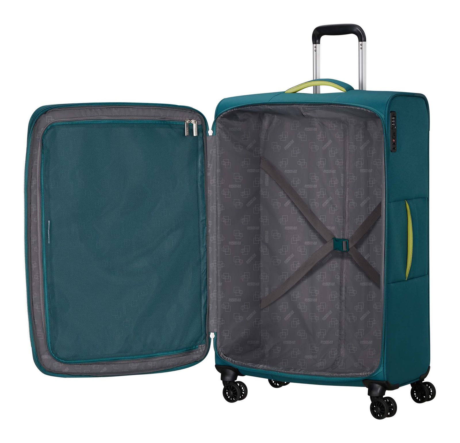 - Das American Tourister Logo ist gut sichtbar eingearbeitet