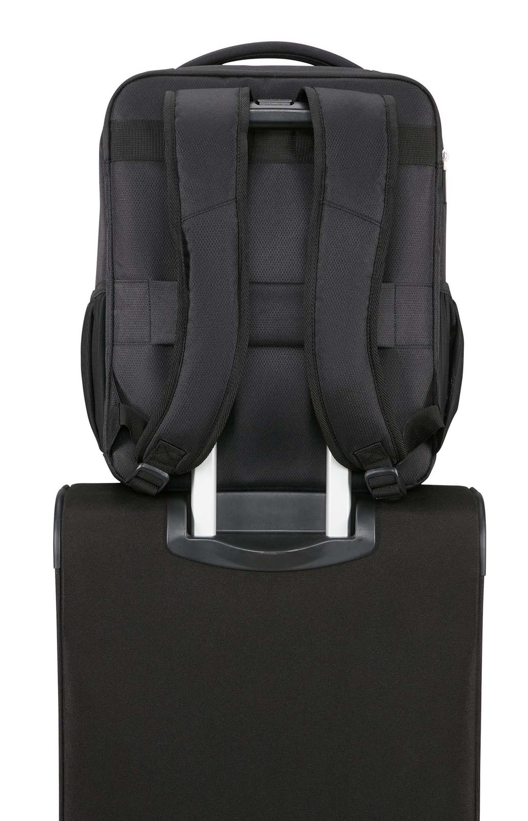 - Auf der Rückseite 1 gepolstertes Laptopfach mit Zipper und 1 Trolleyhalterung