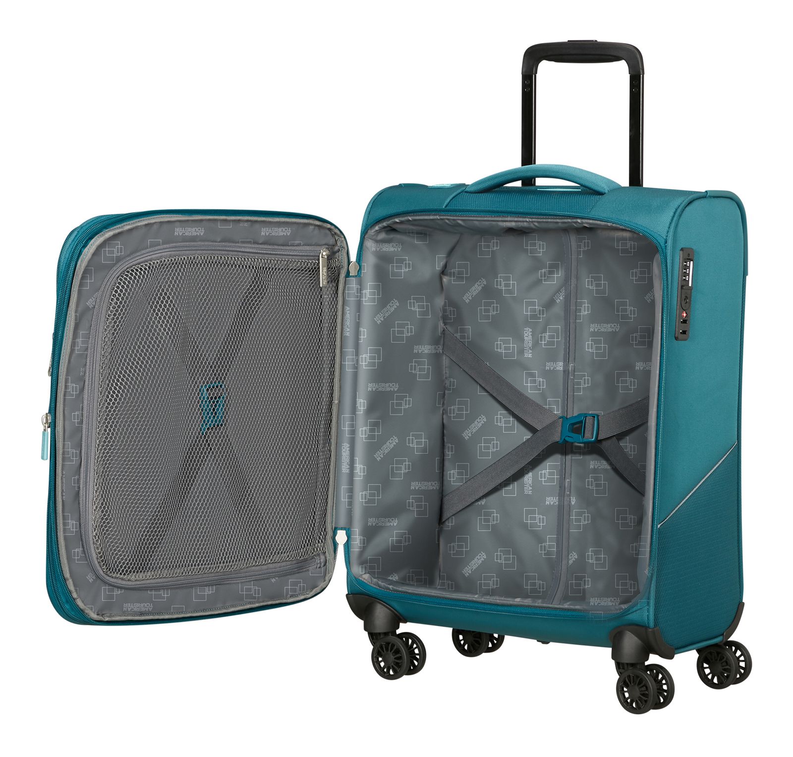 - Das American Tourister Logo ist gut sichtbar eingearbeitet