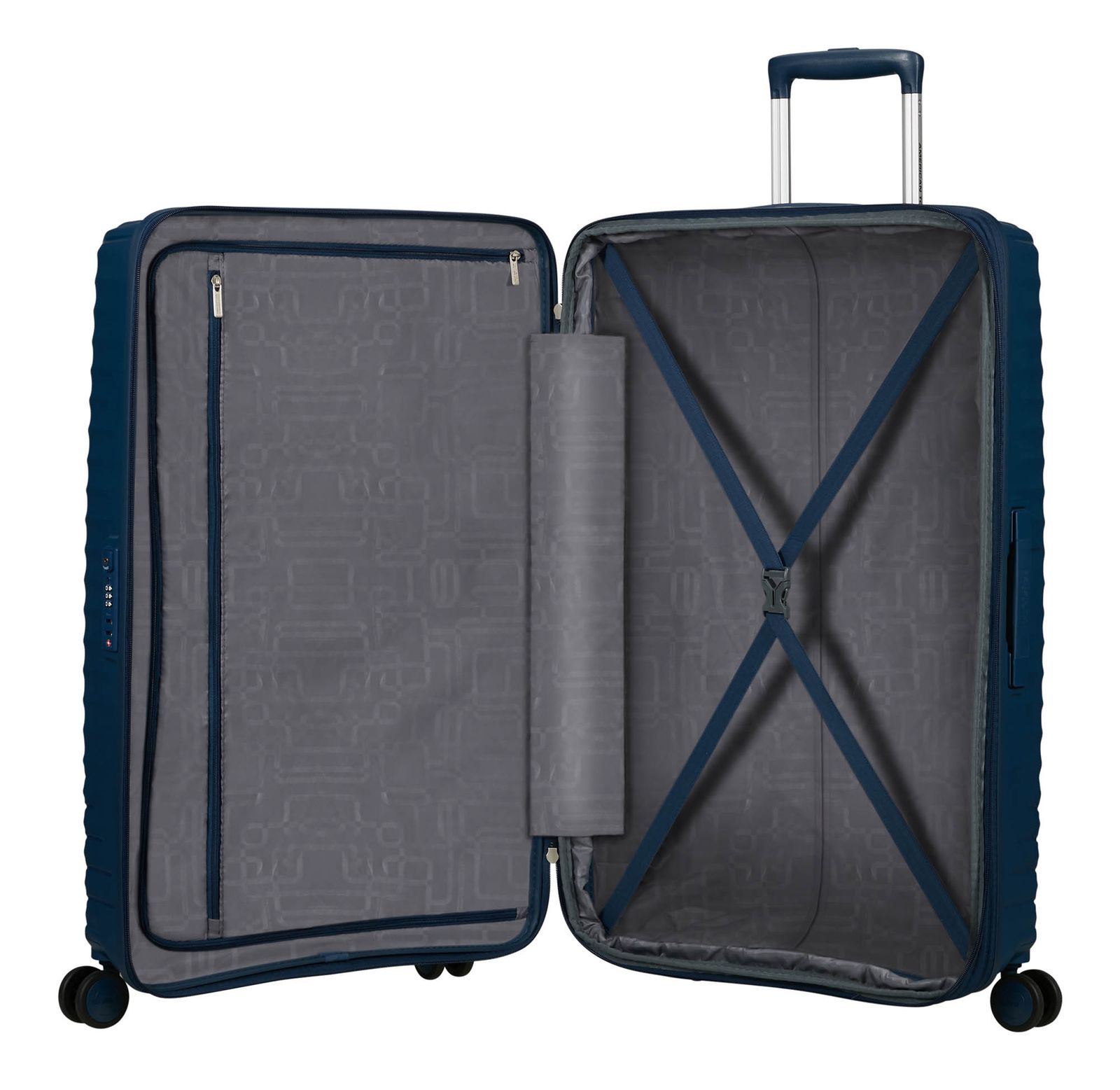 - Das American Tourister Logo ist gut sichtbar eingearbeitet