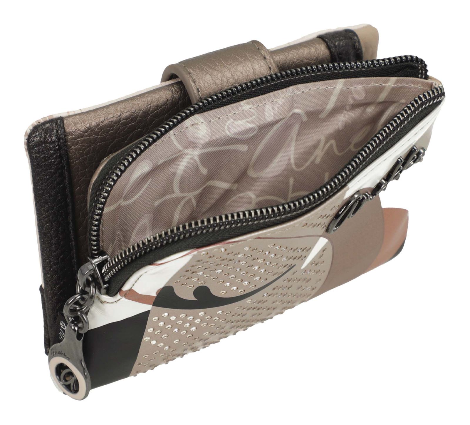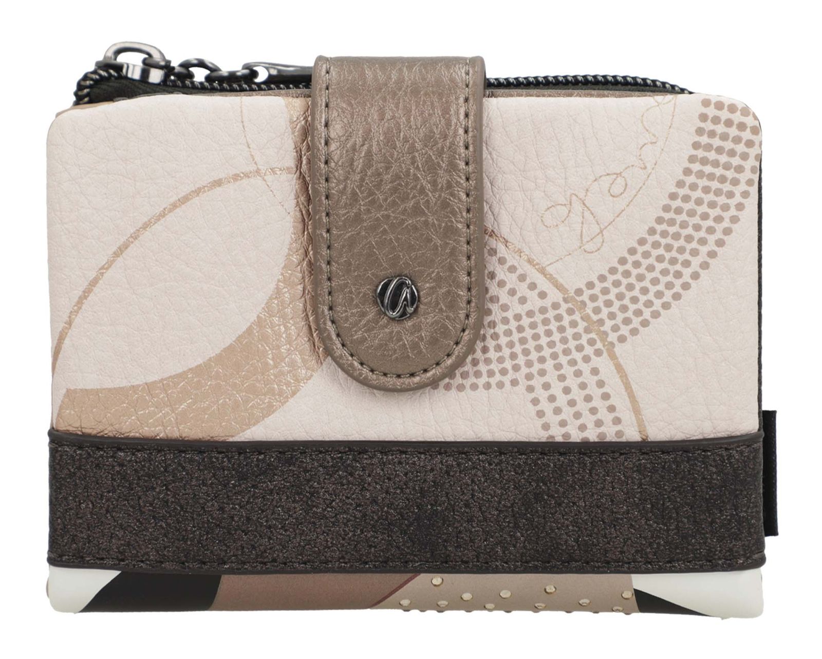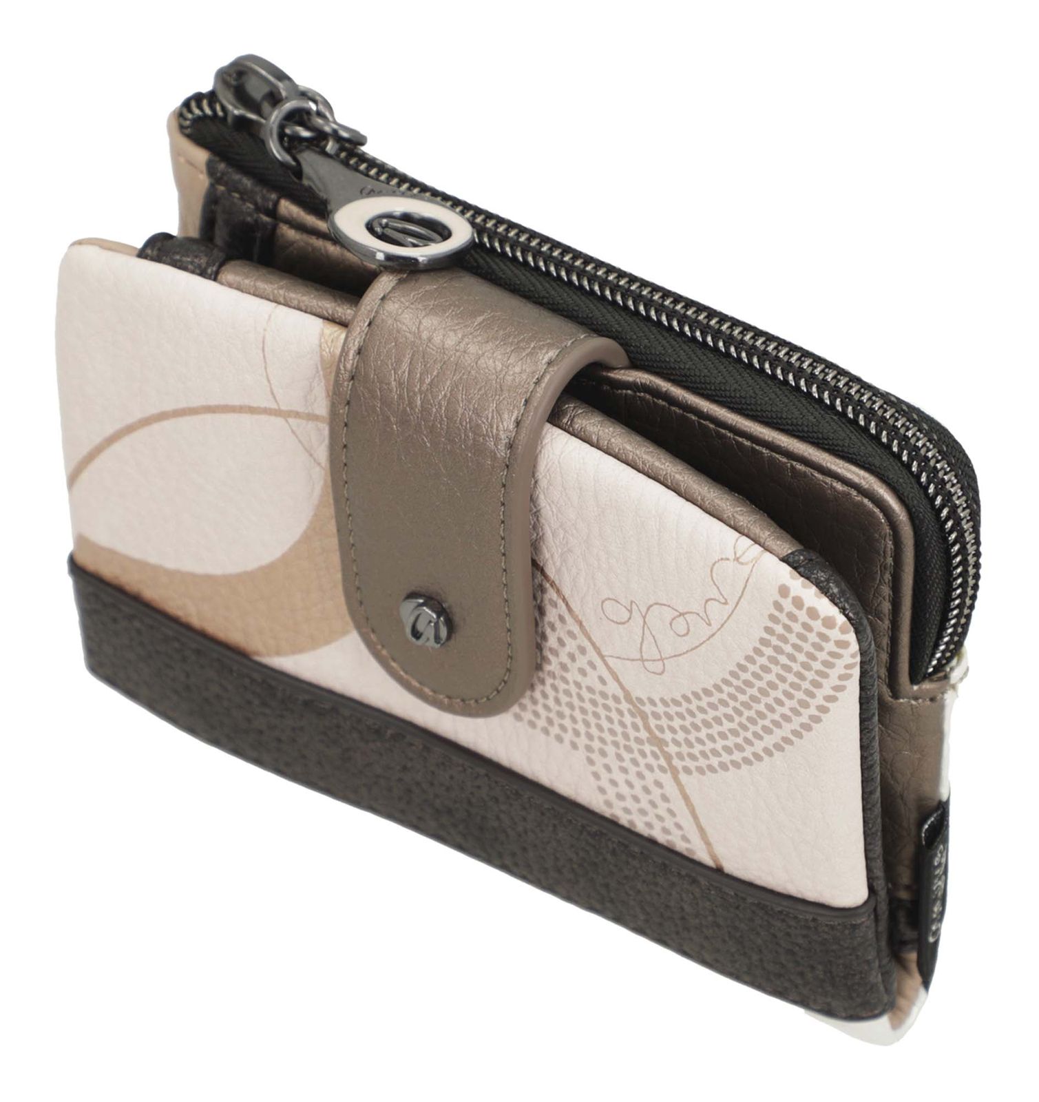 - Geldbörse wird mit Zipper, Lasche und verstellbarem Druckknopf geschlossen