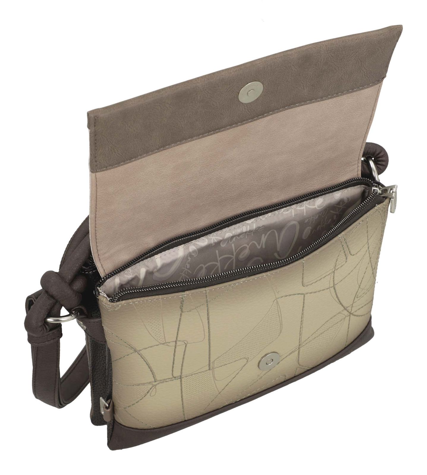 - Umhängetasche wird mit Zipper, Überschlagklappe, Magnetverschluss geschlossen