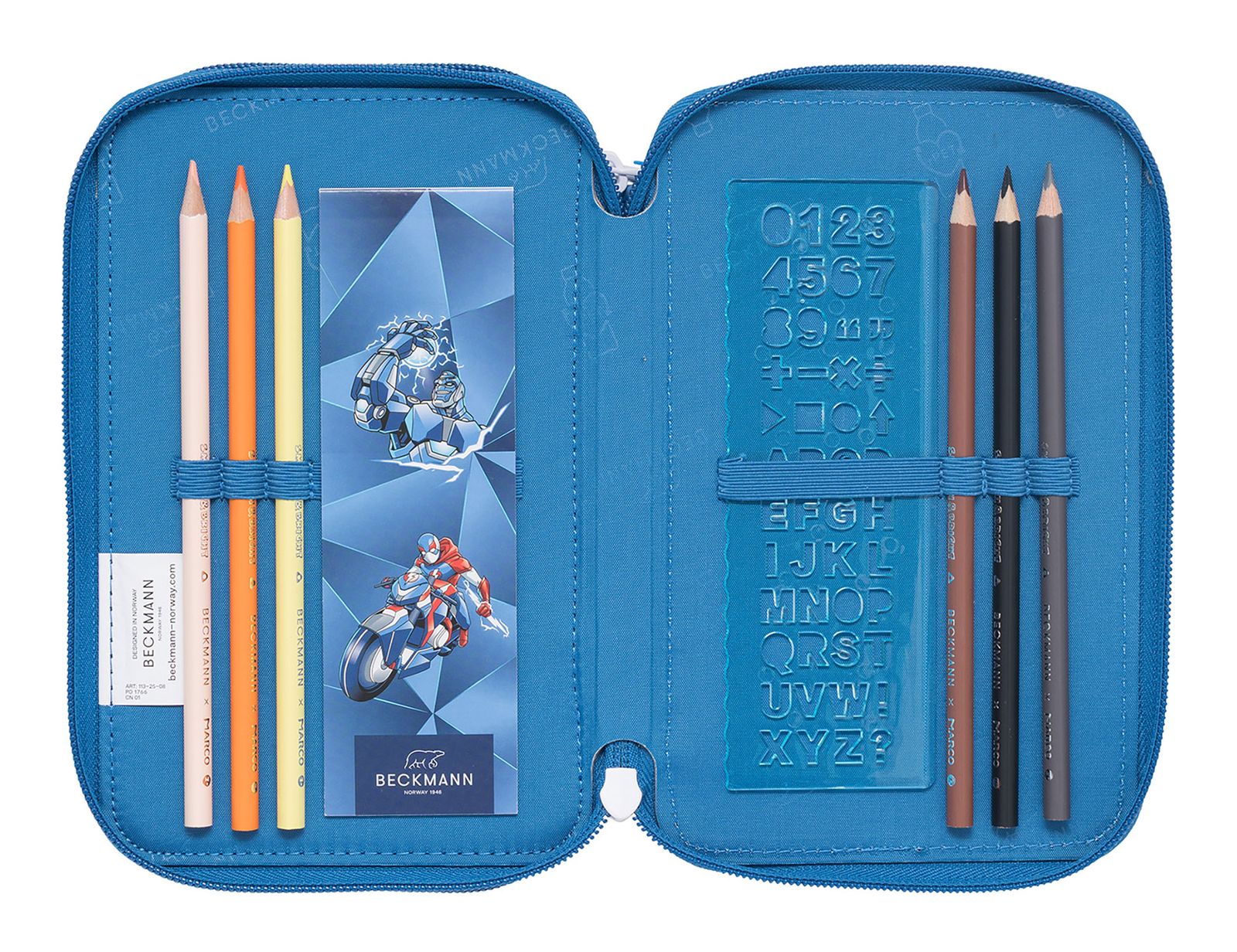 - Lieferumfang: BECKMANN Federmäppchen mit Etikett, 2 x Bleistift, 20 x Buntstift, 2 x Lineal, 1 x Radiergummi, 1 x Spitzer, 1 x Stundenplan, 1 x Notizblock
