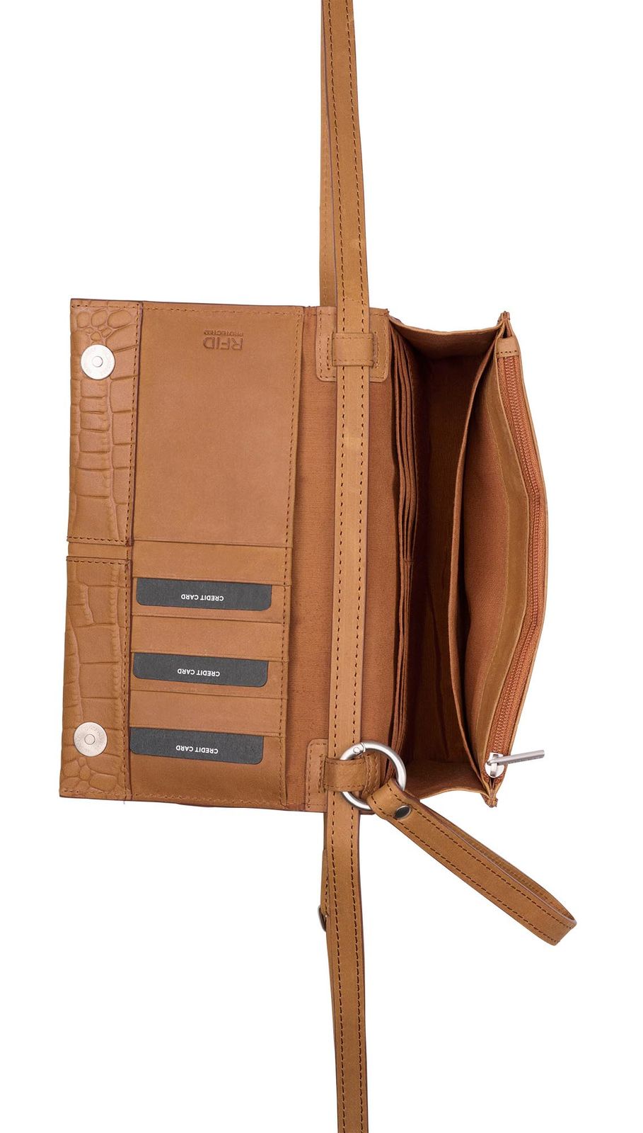 - Im Hauptfach 6 Fächer für Kreditkarten, EC Karten, Visitenkarten etc., 2 Einschubfächer und 1 Zipperfach