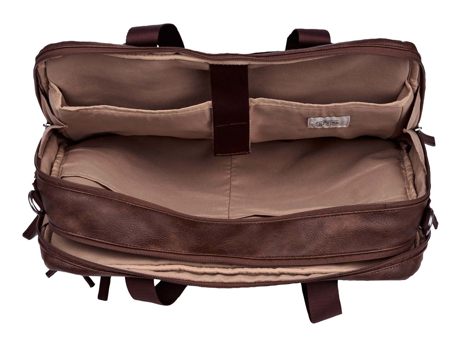- Im hinteren Hauptfach 1 gepolstertes Laptopfach mit Lasche und Klettverschluss und 2 Einschubfächer