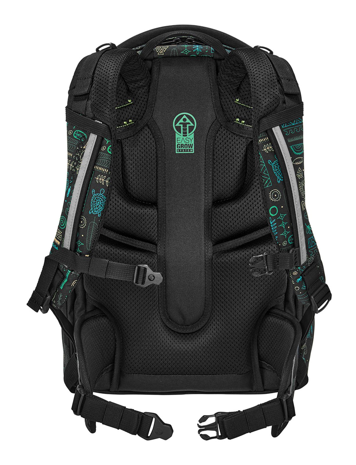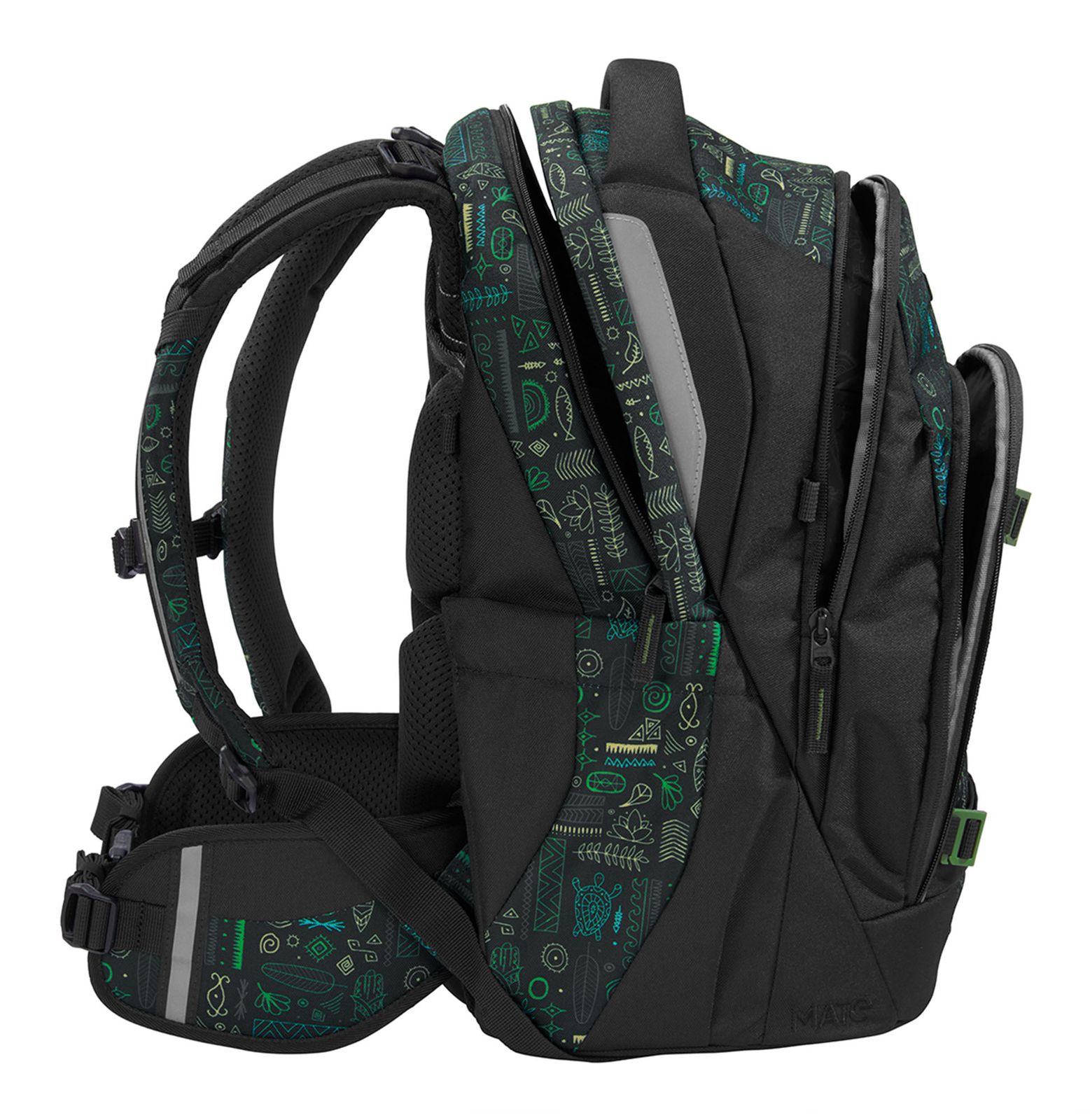 - Schulrucksack mit Etikett und Beckenflosse mit Hüftgurt, Kompressionsriemen, Brustgurt, Patch