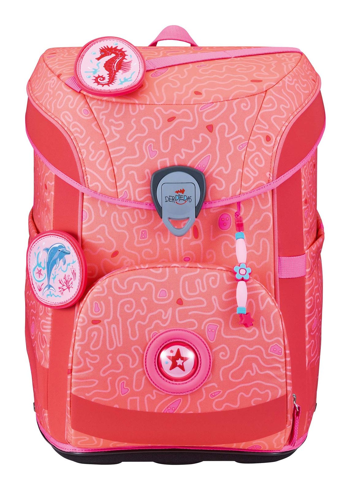- Lieferumfang: DerDieDas Schulranzen mit Etikett, 1 x Namensschild, 2 x Polster, 1 x Schlüsselring, 1 x Beckenflosse mit Hüftgurt, 1 x Bodenplatte, 1 x Sichtfach, 1 x Anhänger