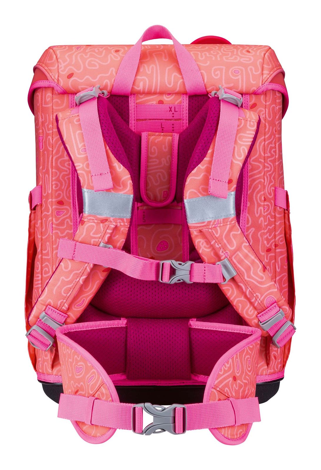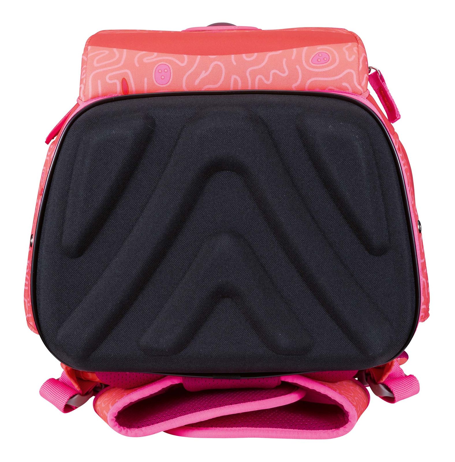 - Schulranzen mit Etikett und Namensschild, Schlüsselring, Beckenflosse mit Hüftgurt, Bodenplatte, Sichtfach, Anhänger, Polster