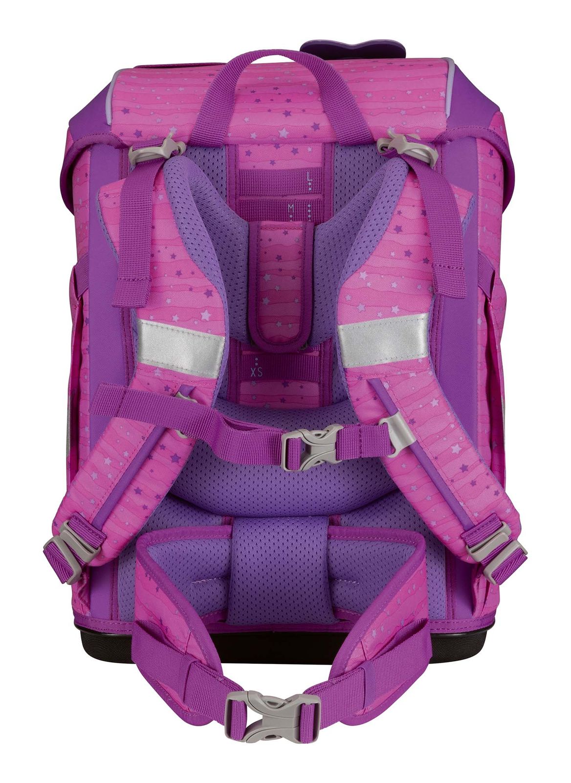- Schulranzen mit Etikett und Namensschild, Schlüsselring, Sichtfach, Beckenflosse mit Hüftgurt, Bodenplatte, Polster