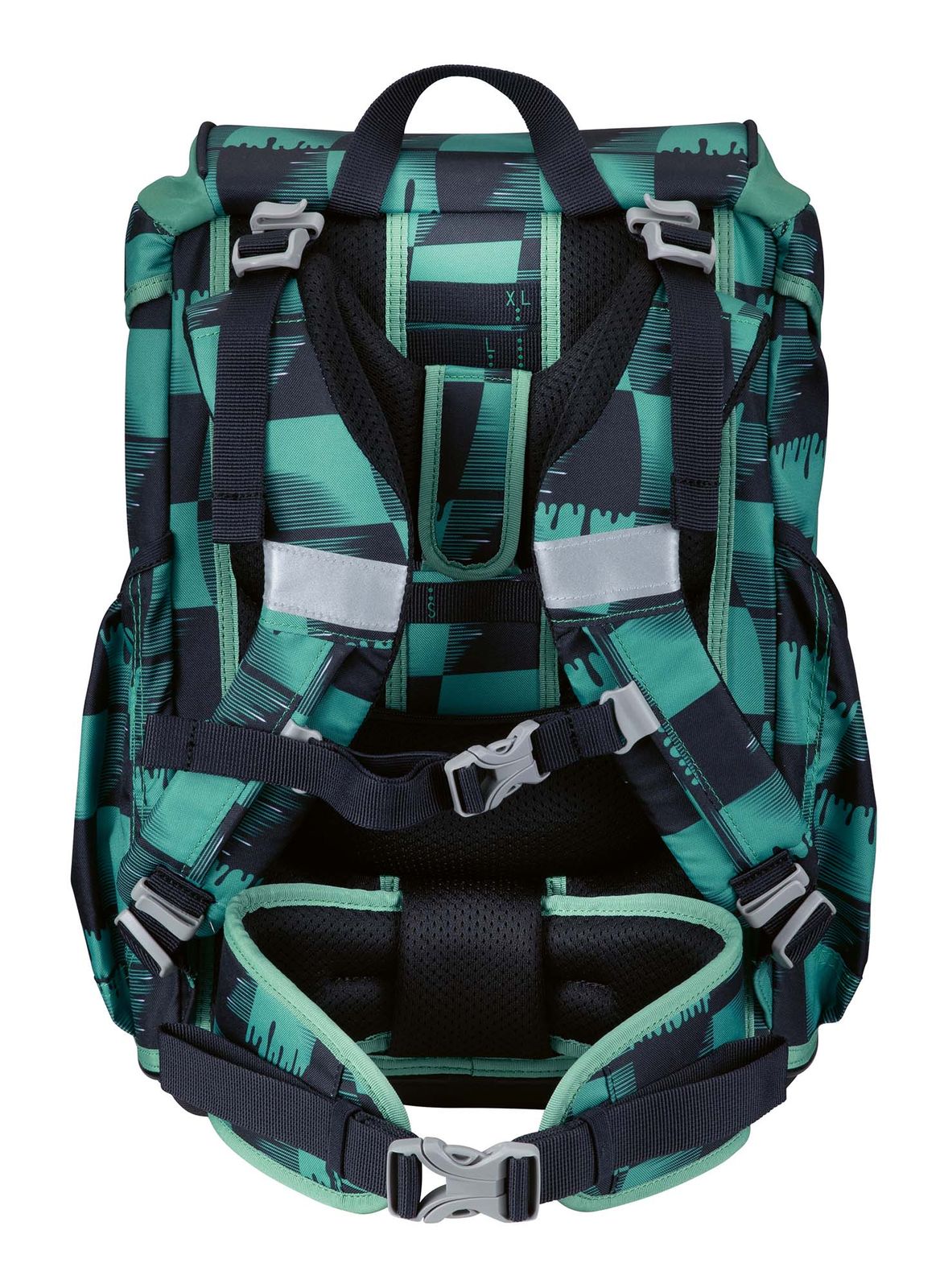 - Schulranzen mit Etikett und Namensschild, Schlüsselring, Beckenflosse mit Hüftgurt, Bodenplatte, Sichtfach, Anhänger, Polster