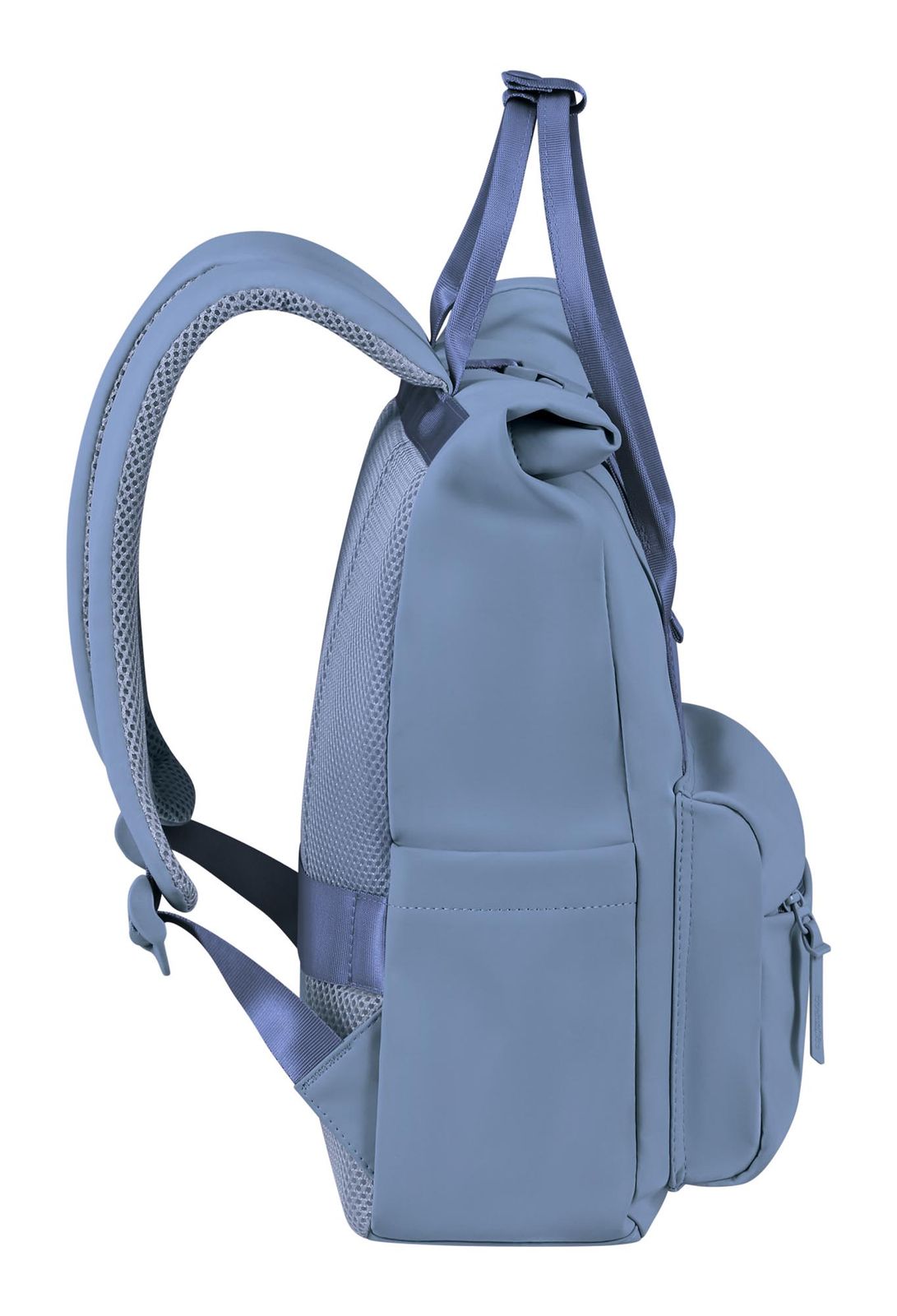 - backpack is closed with zipper, roll closure and infinitely adjustable clip closure