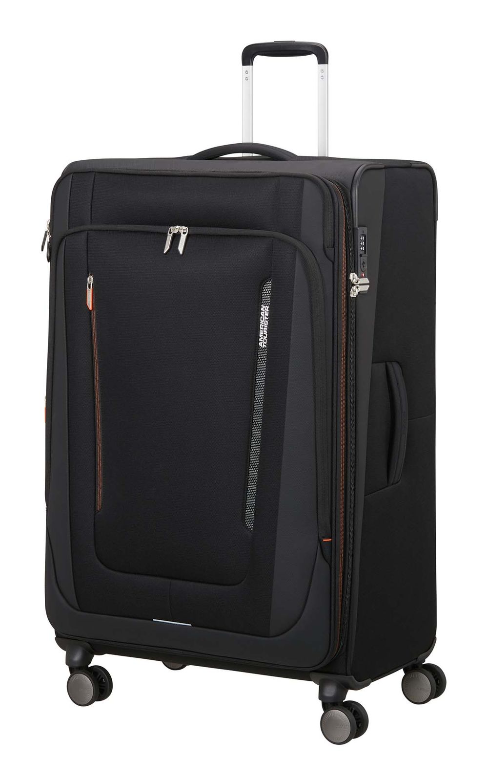 American Tourister trolley with several zipper compartments on the front