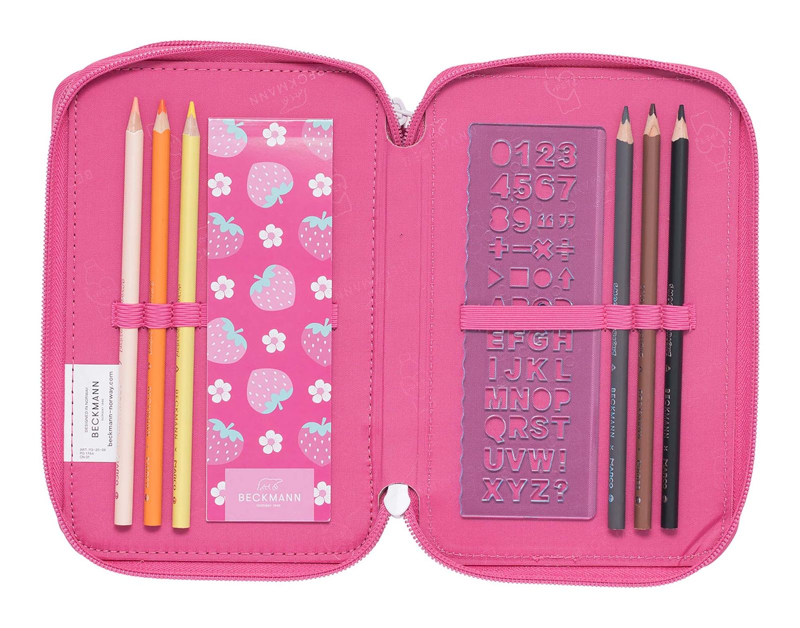 - Scope of supply: BECKMANN pencil case with label, 2 x pencil, 20 x crayon, 2 x ruler, 1 x eraser, 1 x sharpener, 1 x timetable, 1 x notepad