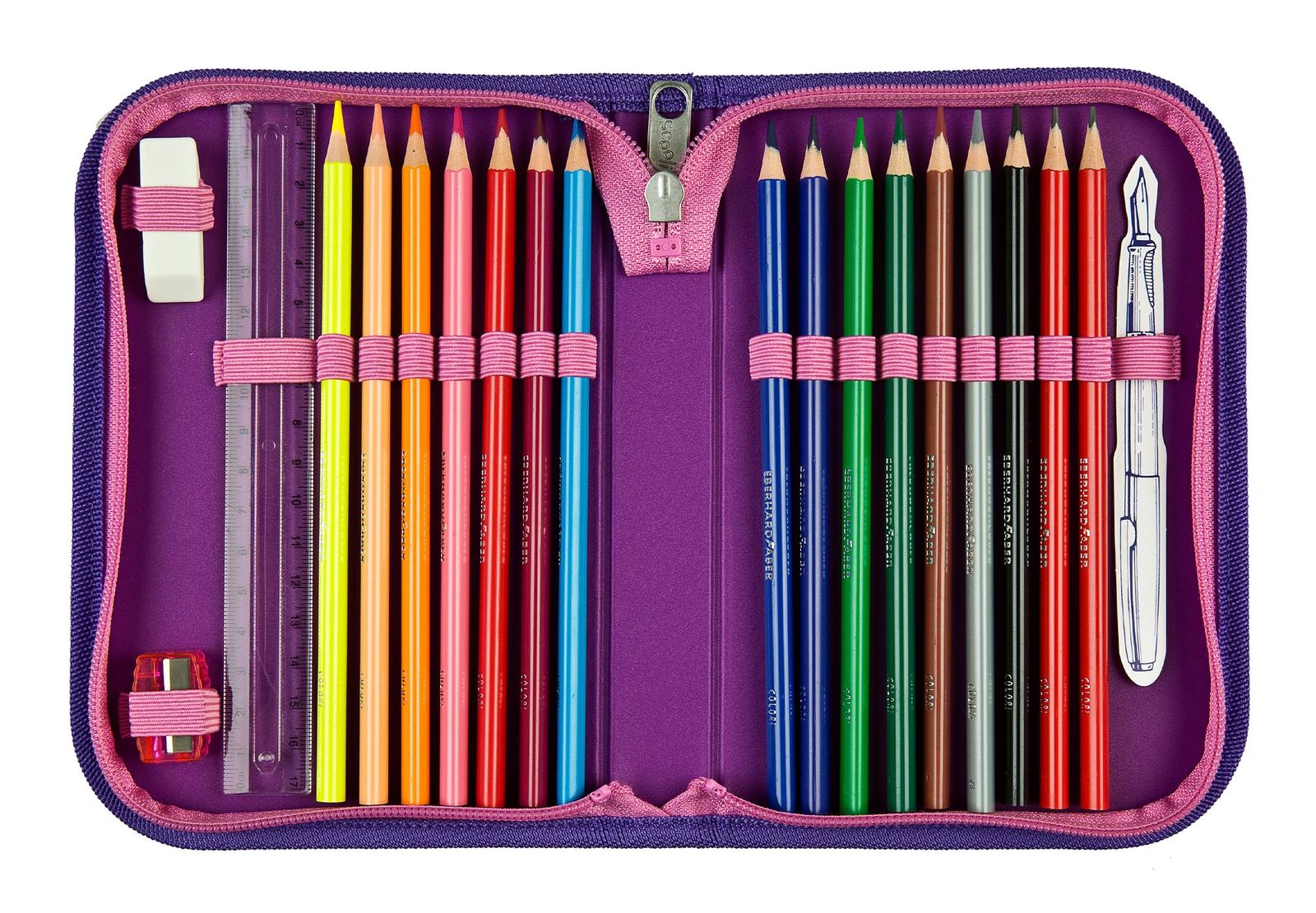 - In the main compartment 17 rubber loops for pens and 3 rubber loops for eraser, ruler etc.