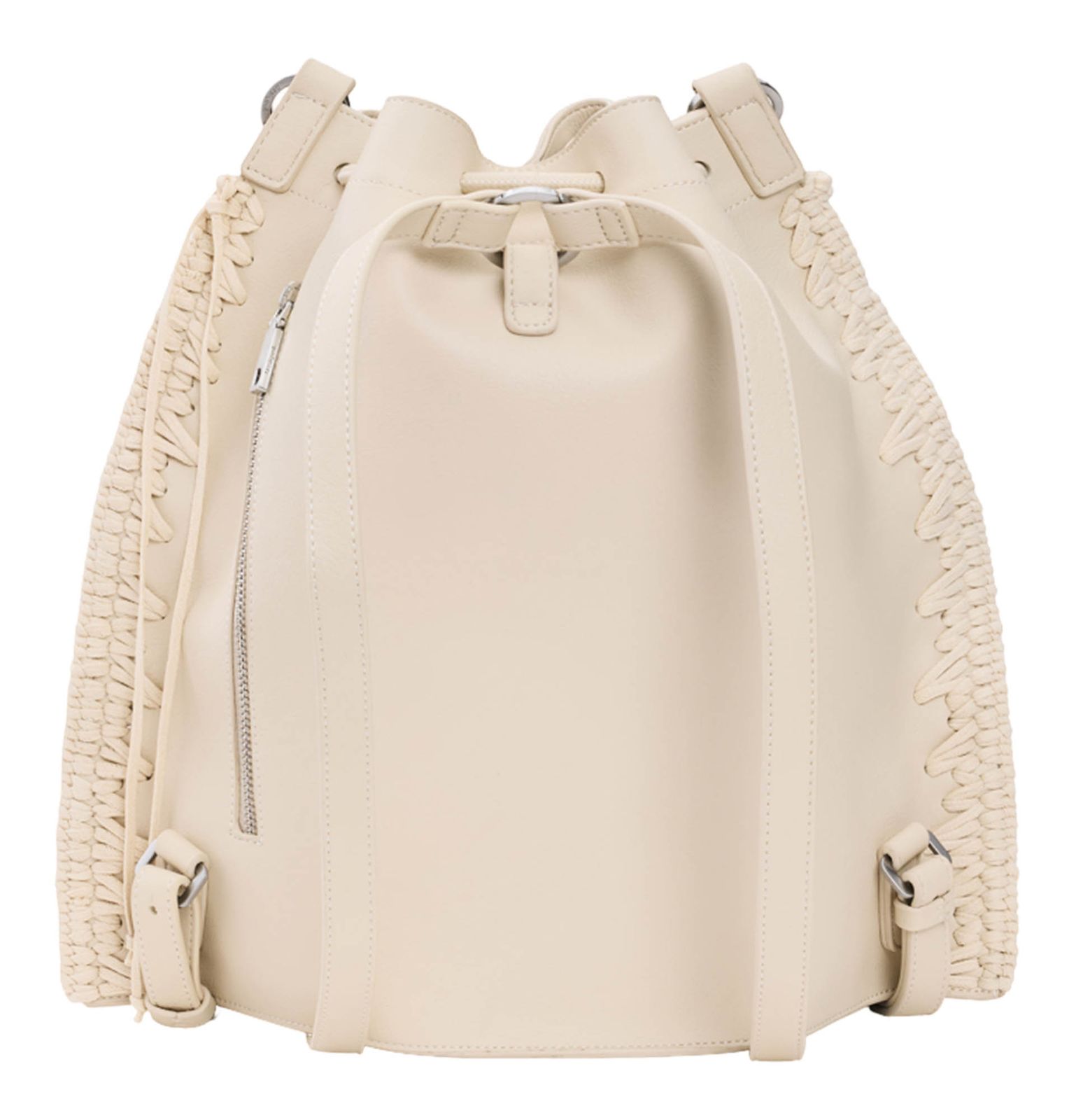 - backpack is closed with zipper and drawstring