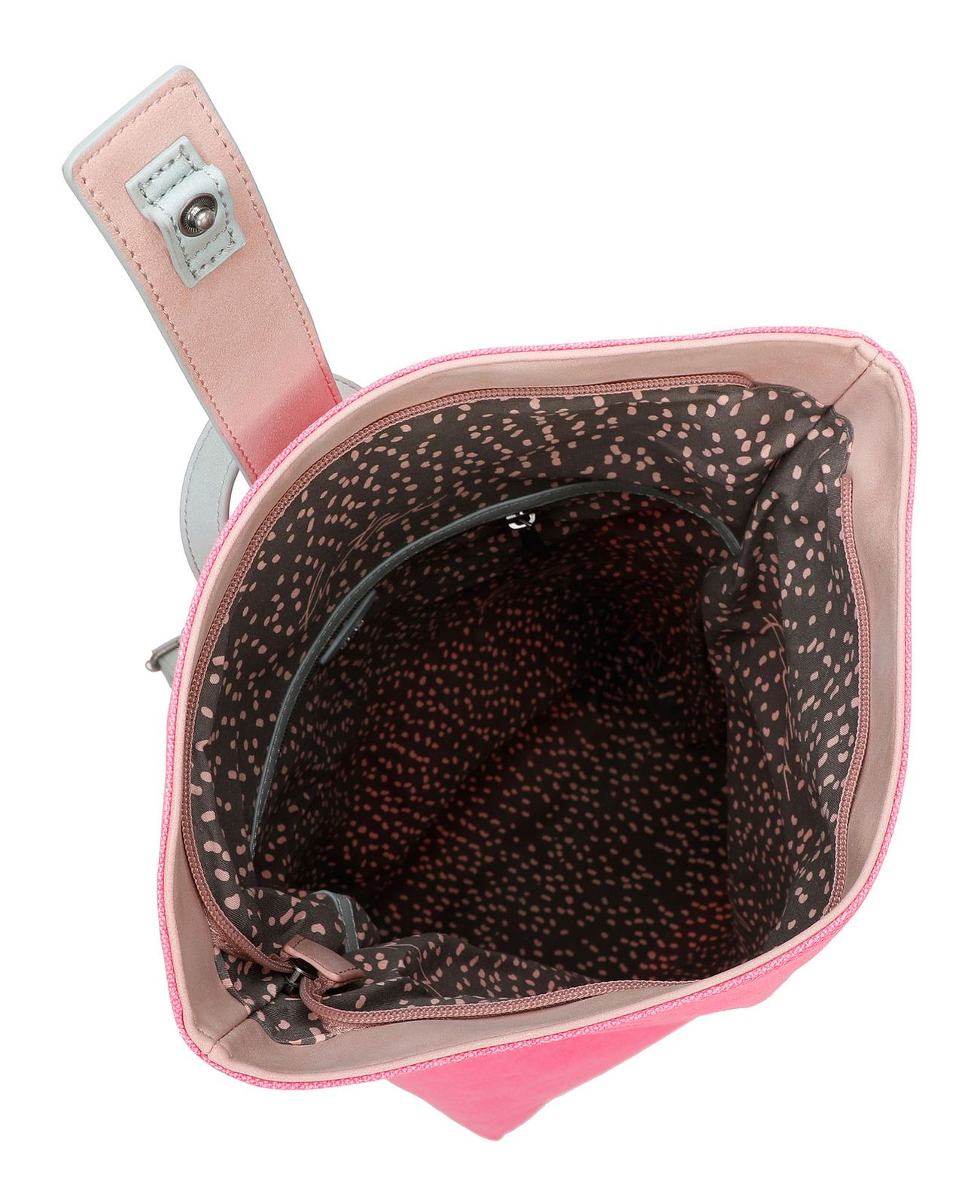 - backpack is closed with zipper, flap and push-button
