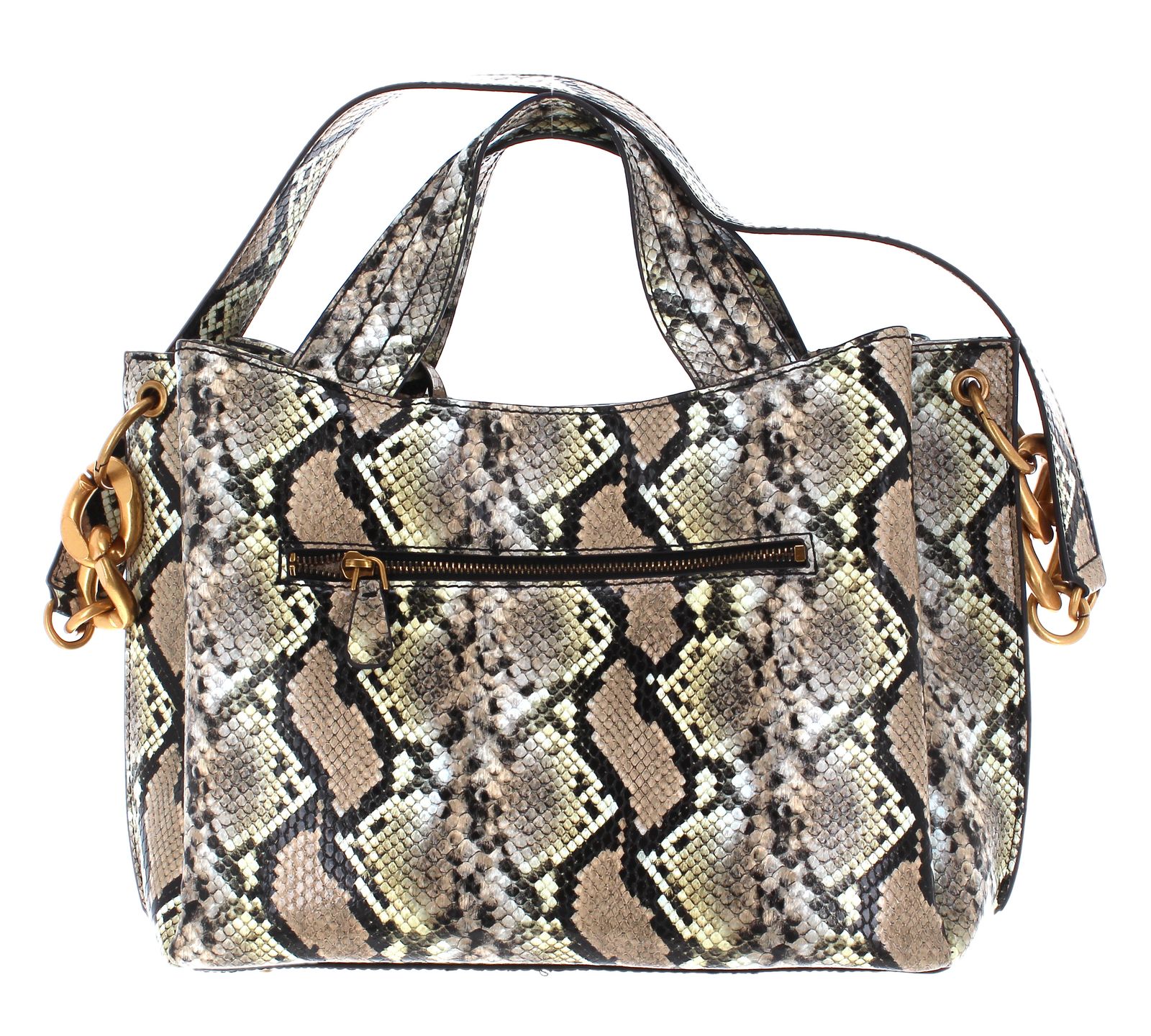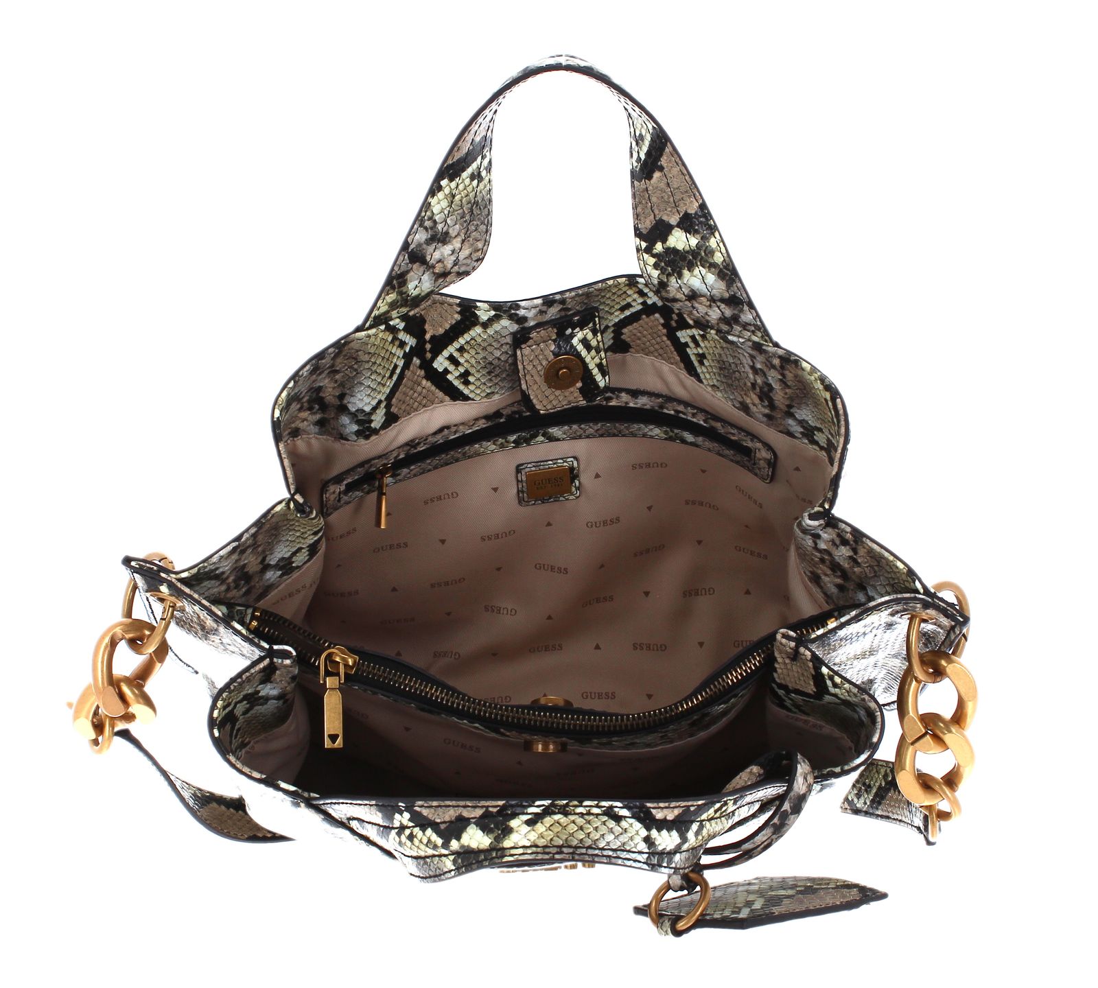 This classy bag from the brand GUESS in snakeskin look will give your outfits a noble touch. In the two spacious main compartments you have enough storage space for all your essentials. The gold-colored applications add an elegant and classy look to this shoulder bag and thus make your outfit appear in stylish class. Get involved in the wonderful GUESS Zed Girlfriend Carryall .