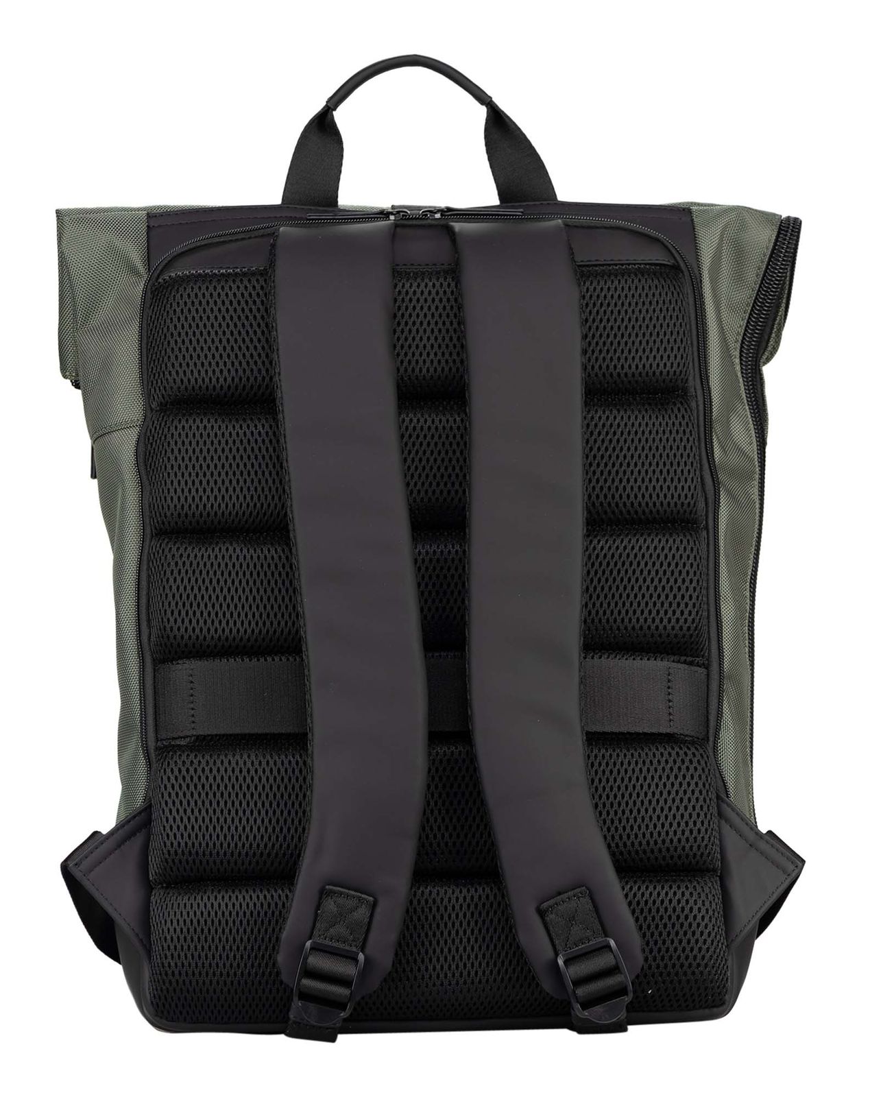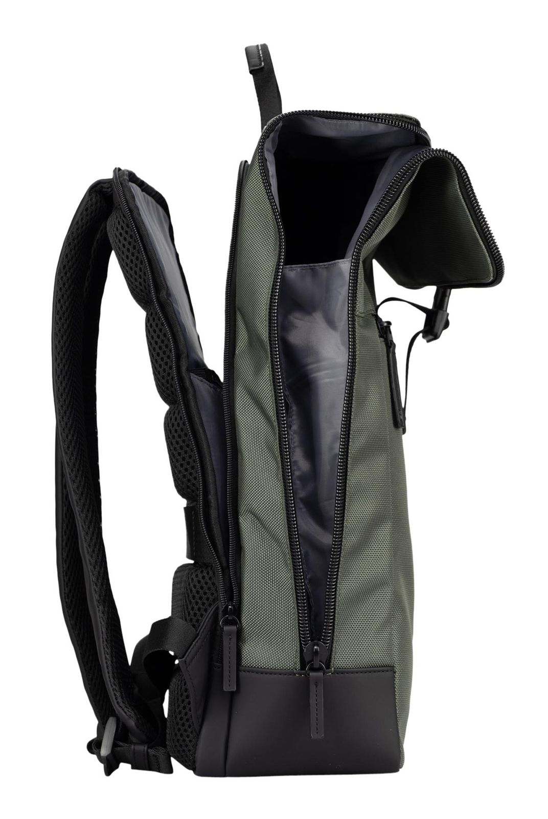 - backpack is closed with infinitely adjustable clip closure, zipper and roll closure