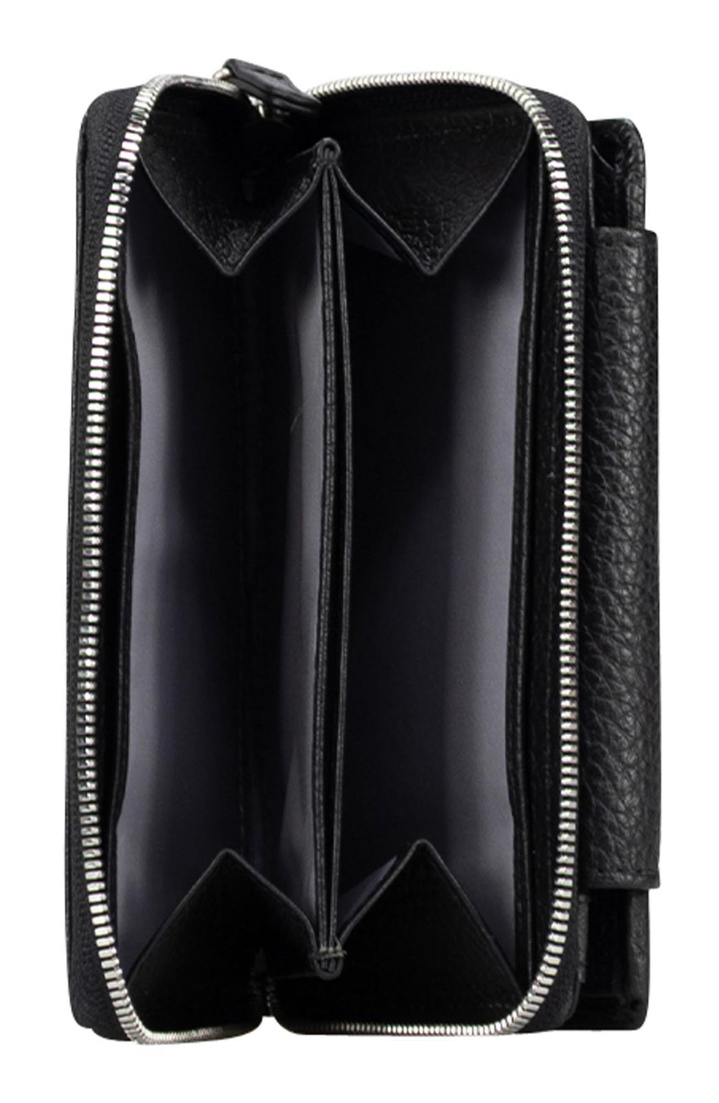 - On the back, 1 zipped compartment, in which there are 2 slide-in compartments for coins / change, 2 side compartments and 1 transparent compartment