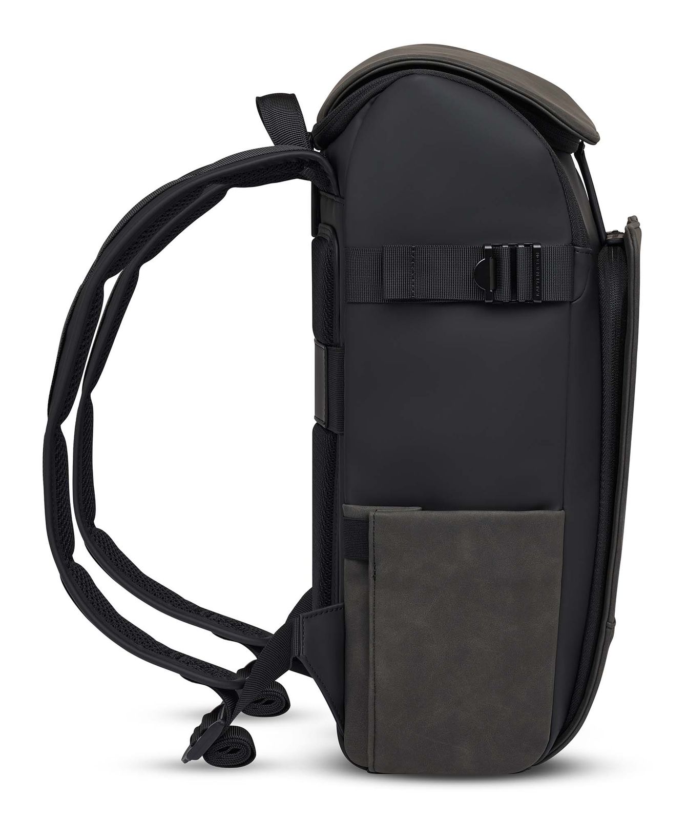 - On the left side, 1 elastic slide-in compartment for water bottles or umbrellas and 1 infinitely adjustable compression straps