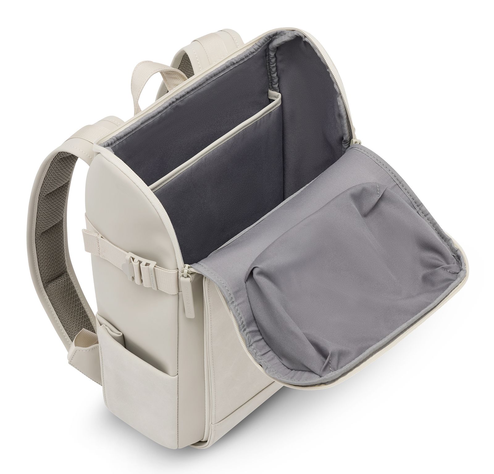 Inspired by golden sandy beaches, tropical lifestyle and a longing for freedom, the Bali Medium Backpack by Mariefeandjakesnow is more than just a backpack. It is your daily travel companion with Soul. Designed in collaboration with the travel duo mariefeandjakesnow, this design combines the gentle elegance of Balinese nature with the functionality that true adventurers need. Particular attention was paid to the choice of materials: The vegan tech material used is water repellent, robust and durable, and at the same time pleasantly light – ideal for changeable weather conditions and intensive use. The reinforced back area supports a healthy posture, while the practical trolley holder on the back makes the Bali Medium Backpack by Mariefeandjakesnow the ideal companion when travelling - simply attach it to the rolling suitcase and move through the airport in a relaxed manner.
