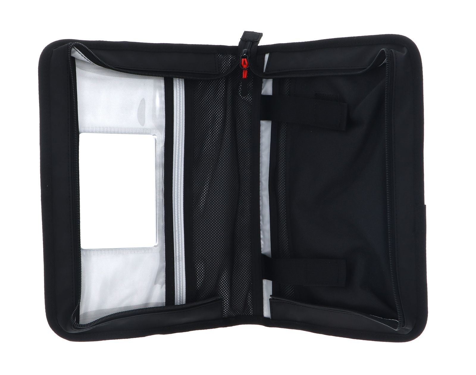 - In the main compartment 1 hook for hanging, 1 removable mirror, 1 transparent slide-in compartment, 1 mesh zipper compartment, 1 mesh pocket with hook-and-loop fastener and 1 slide-in compartment with hook-and-loop fastener