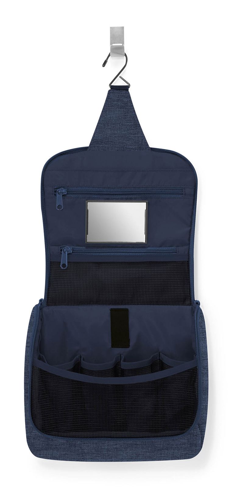 - In the main compartment 5 mesh pockets, 1 elastic loop, 1 mesh zipper compartment, 1 zipped compartment, 1 slide-in compartment, 1 attachment option with hook-and-loop fastener for mirror and 1 hook for hanging