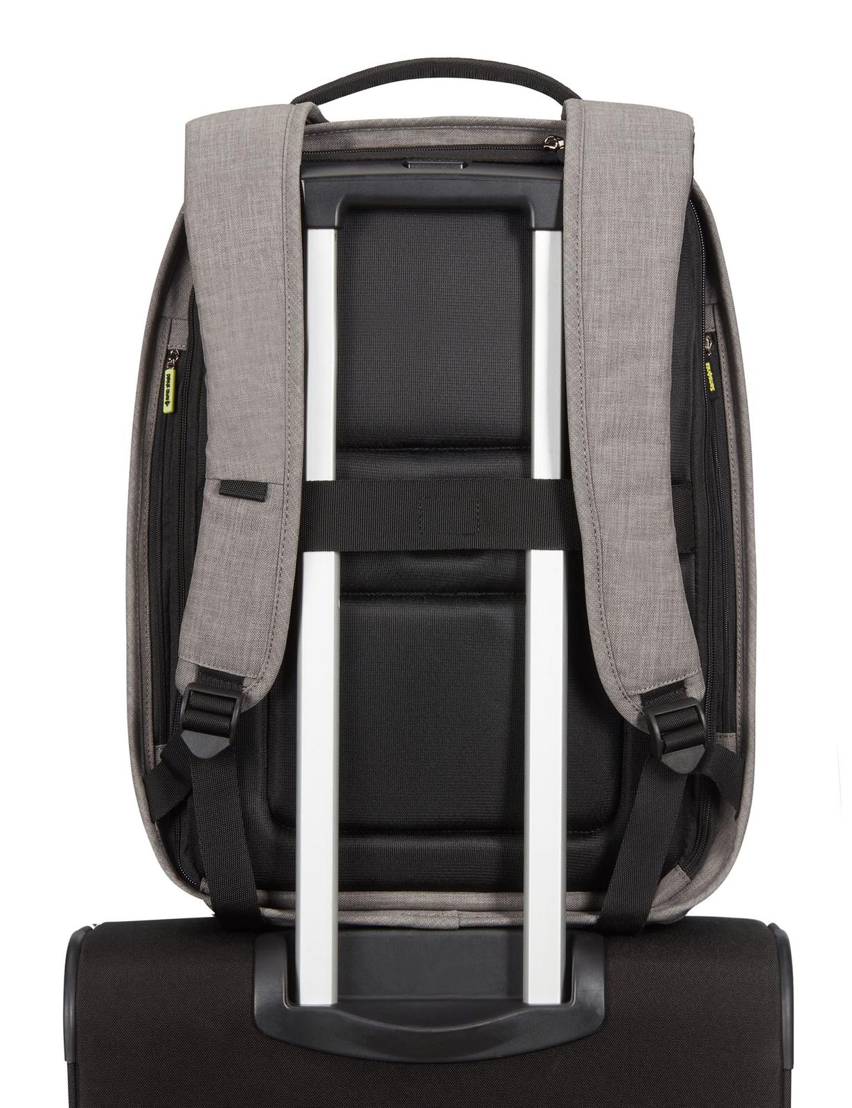 - On the top, 1 concealed USB port and 1 zipped compartment