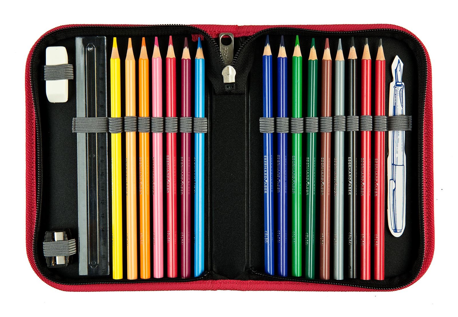 - In the main compartment 17 rubber loops for pens and 3 rubber loops for eraser, ruler etc.