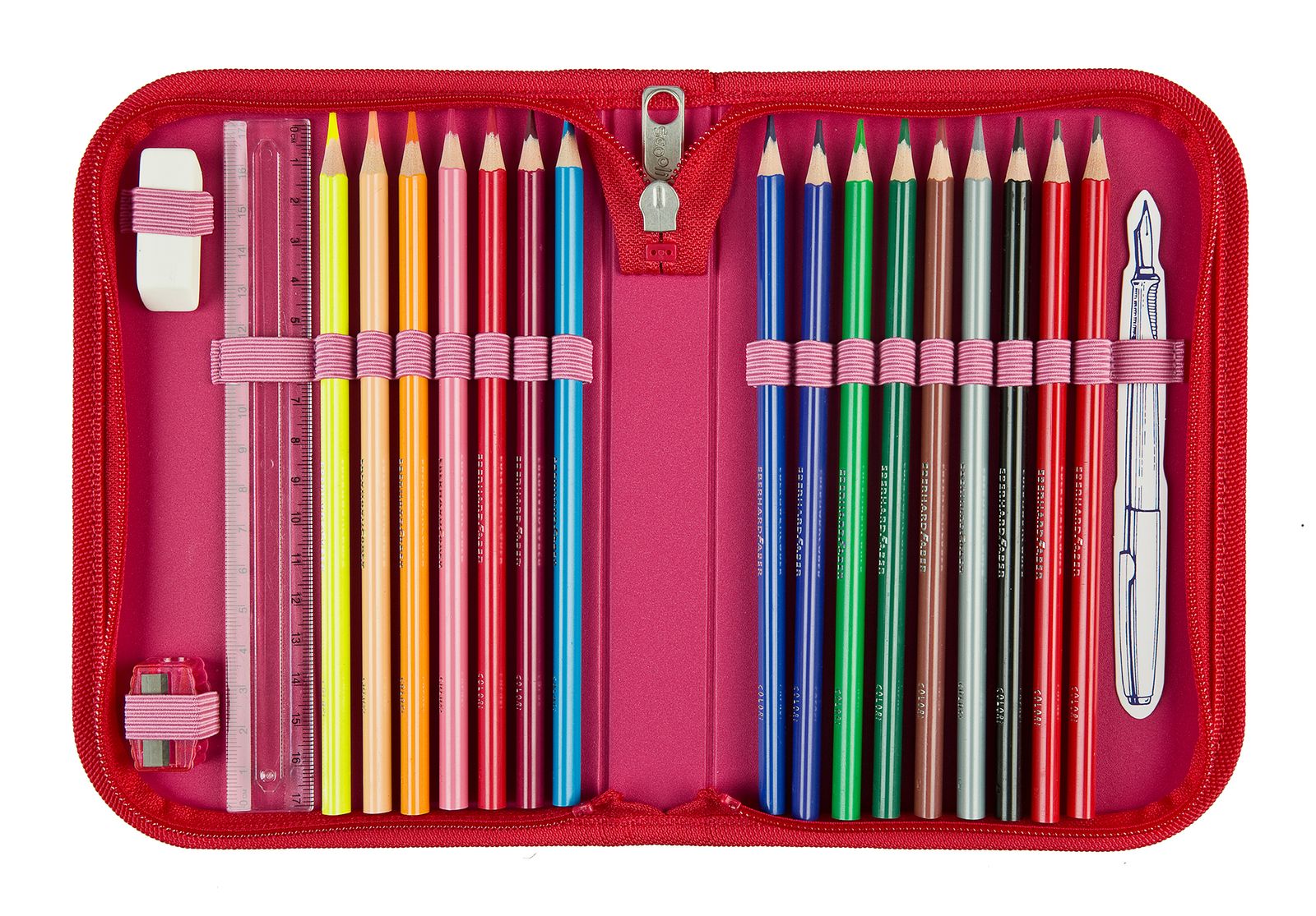 - Scope of supply: Scooli pencil case with label, 1 x ruler, 1 x eraser, 1 x sharpener, 2 x pencil, 14 x colored pencil