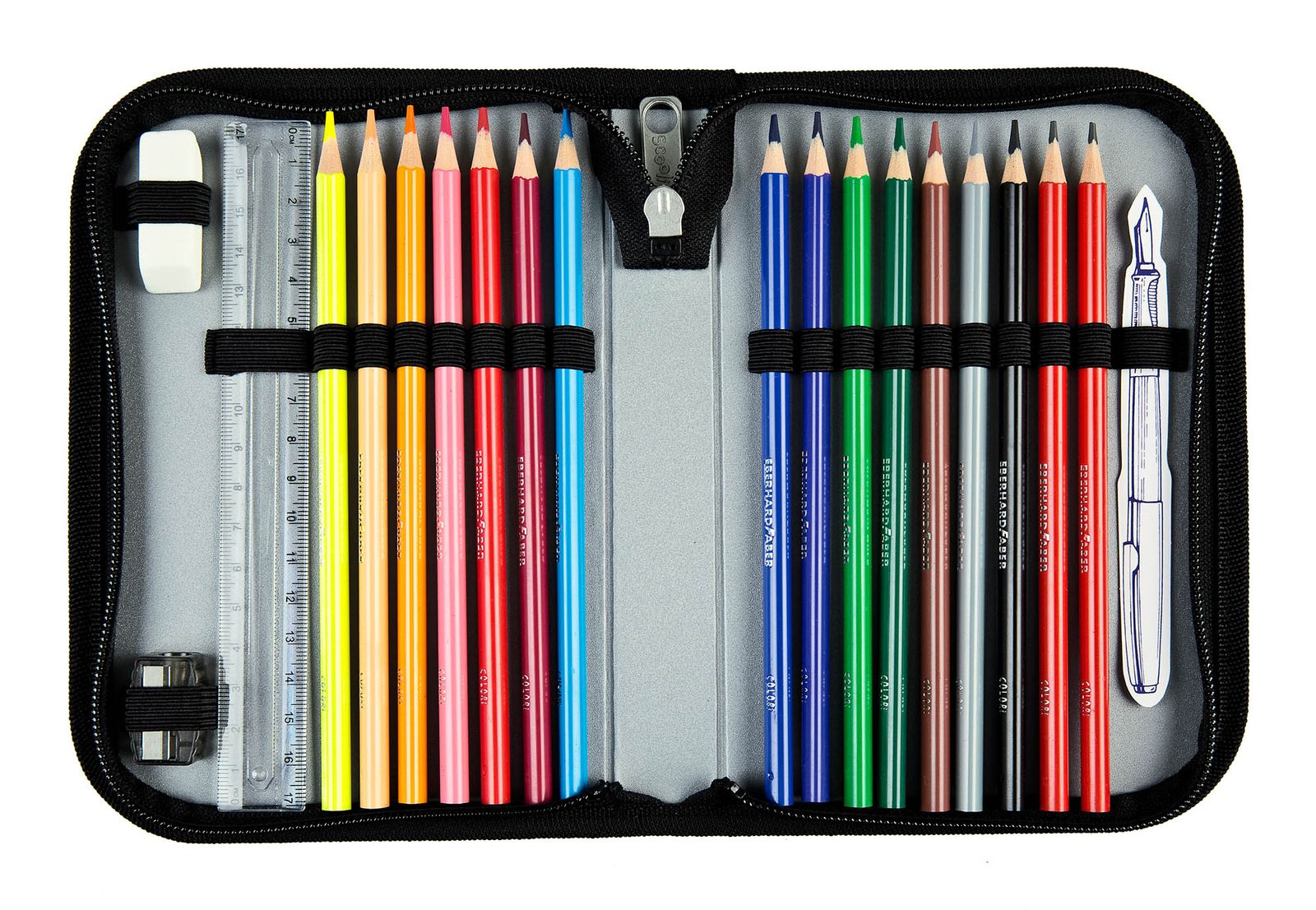 - In the main compartment 17 rubber loops for pens and 3 rubber loops for eraser, ruler etc.