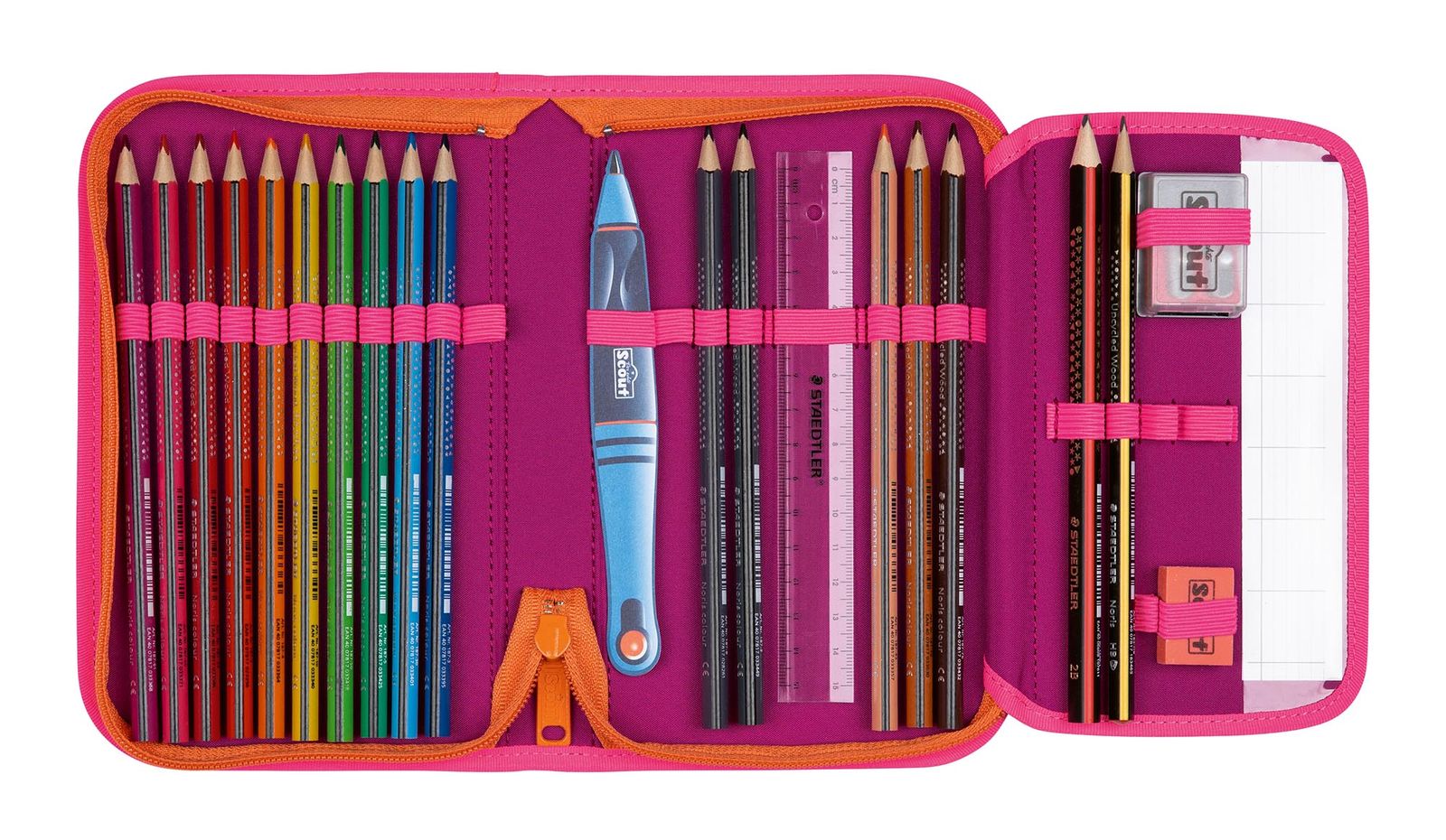 - Contents: Scout pencil case with label, 2 timetable, 15 pens, 1 ruler, 1 eraser, 1 pencil sharpener, 2 pencil