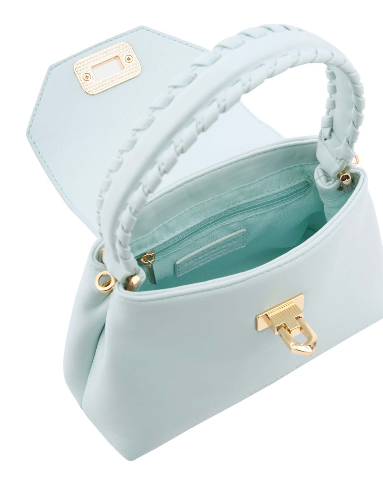 - handbag closes with flap and buckle closure