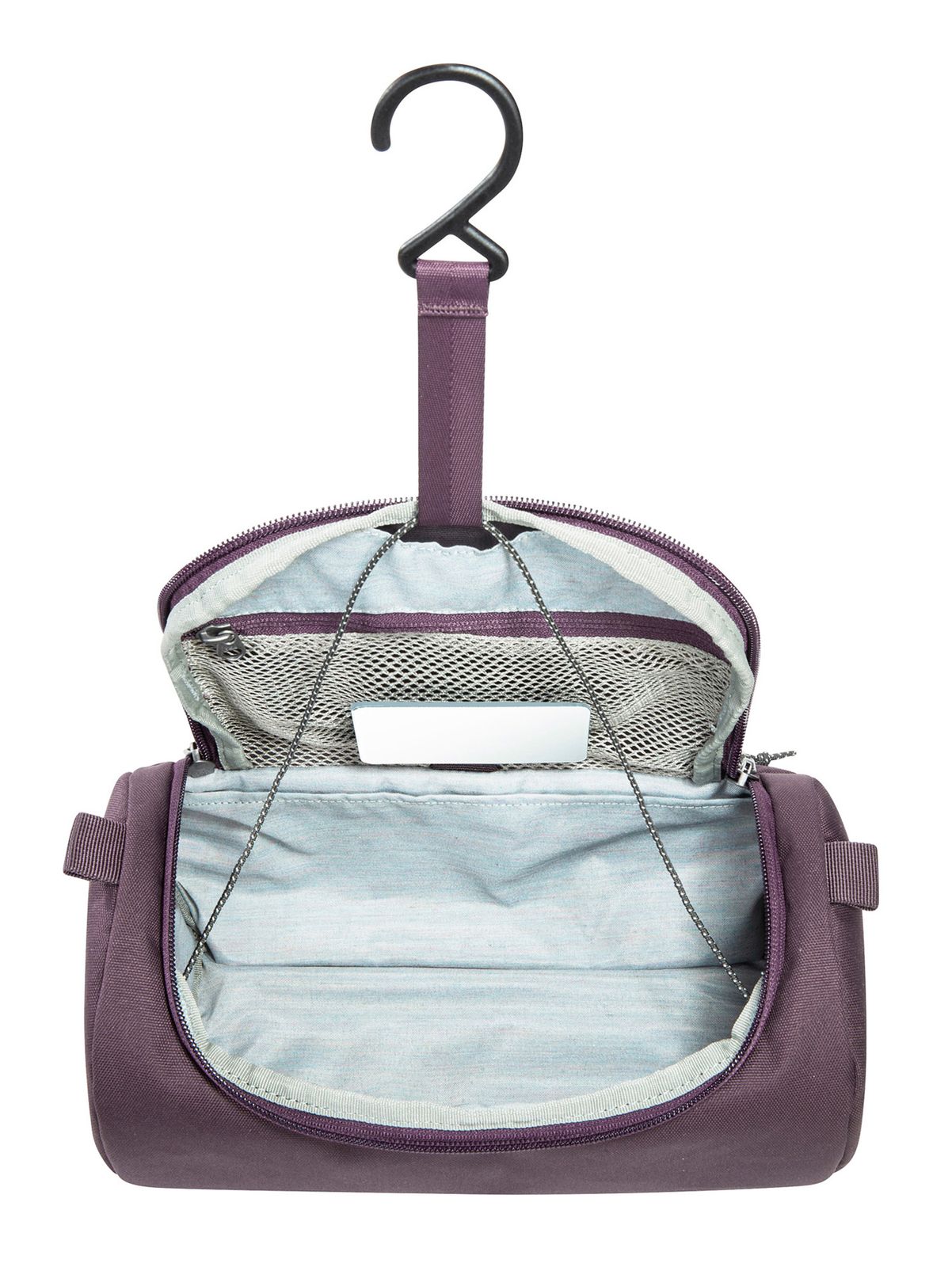- In the main compartment 3 slide-in compartments, 1 detachable mirror, 1 attachment loop, 1 hook for hanging, 1 cord for hook for hanging and 1 mesh zipper compartment