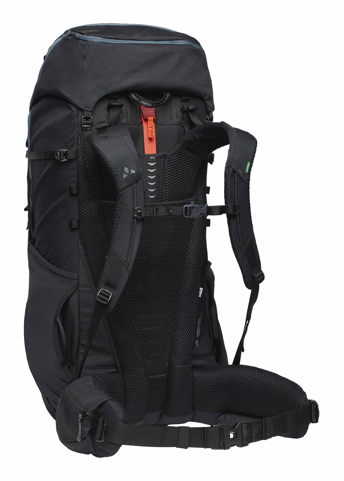 The Tergolight Pro carrying system of the VAUDE Avox 75 + 10 ensures optimal weight distribution, the special back padding of the backpack relieves pressure and the gap in the lower back area can prevent pressure pain. Padded Ergoshape shoulder straps relieve the arms. The back length and load positioning are individually adjustable and ensure a correct fit of the trekking backpack. The waistbelt ensures extra comfort. The backpack can be conveniently packed from the top and front so you have quick and easy access to everything. A sleeping bag can be stored in the bottom compartment. Well thought-out and organized, the backpack has a wide variety of compression straps, mounting options and compartments. The height-adjustable, removable lid allows a further 10 litres to be loaded and can also be converted into a hip bag. With the integrated rain cover , the backpack defies any weather.