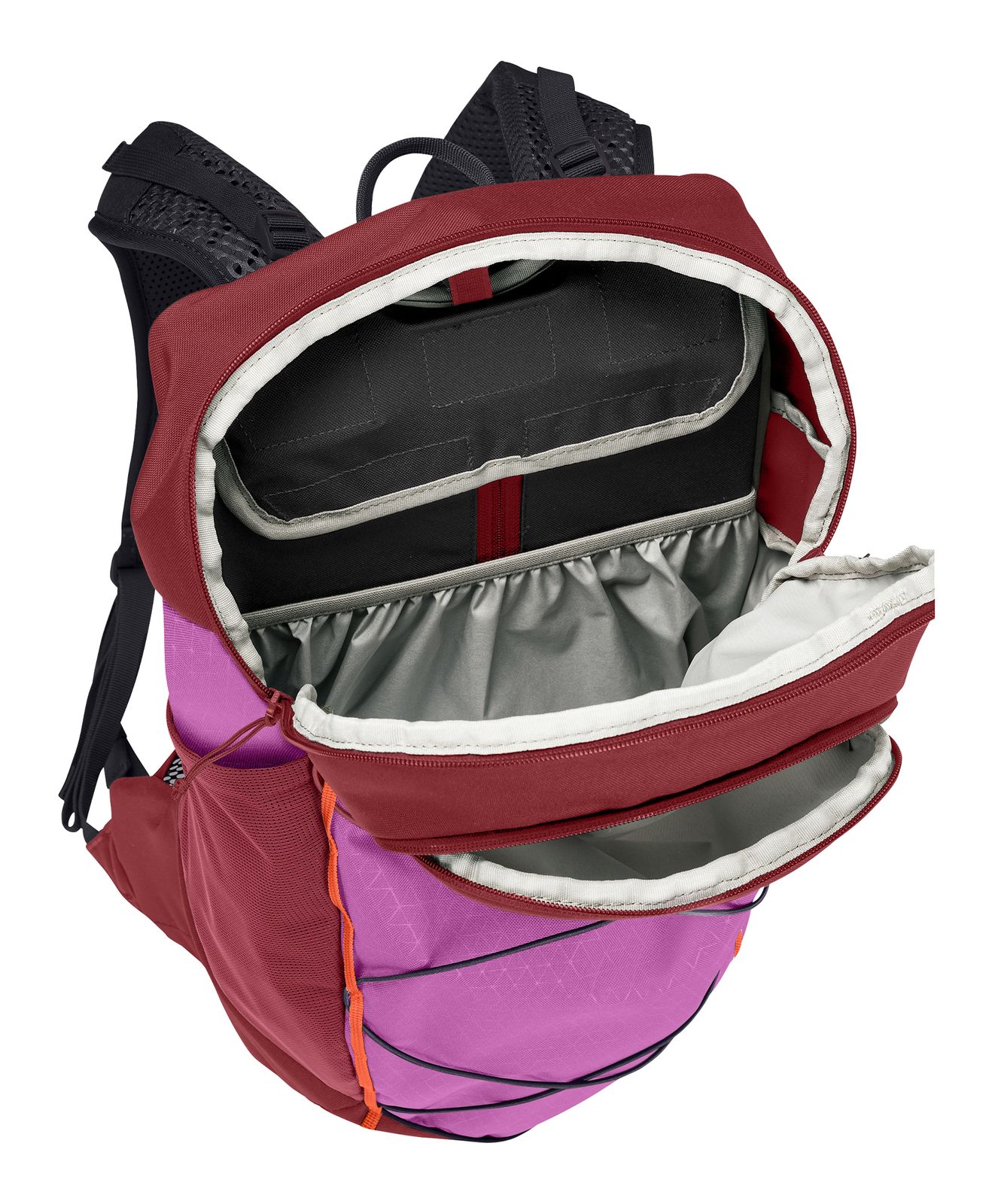 - In the main compartment 1 elastic hydration bladder compartment, 1 flap with hook-and-loop fastener for hydration systems and 1 drinking tube entry