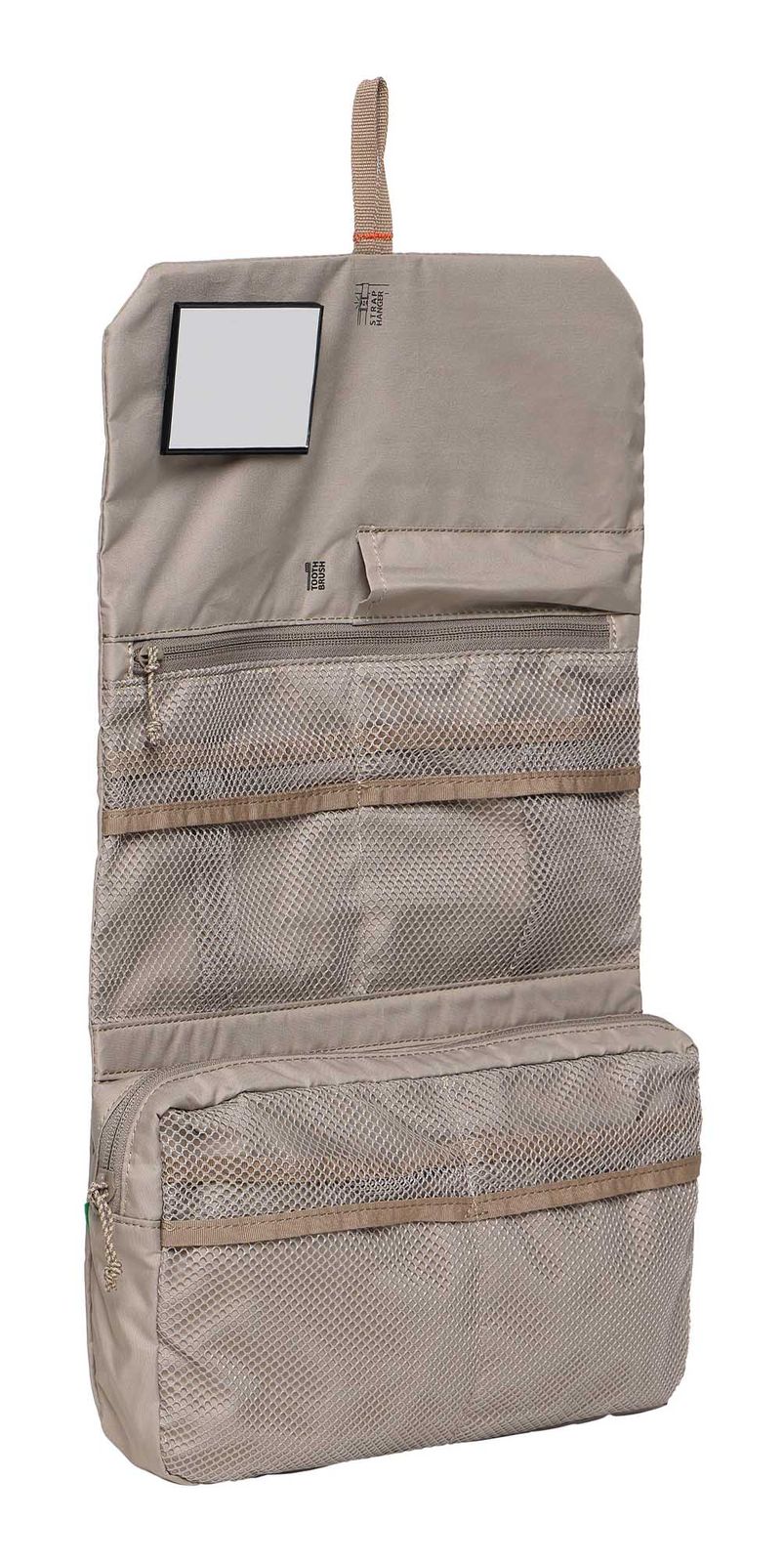 - In the main compartment 1 fastening loop, 1 mesh zipper pocket, 1 slide-in compartment, 1 attachment with hook-and-loop fastener for mirror, 4 mesh slide-in pockets, 1 removable mirror and 1 patch mesh zipper compartment