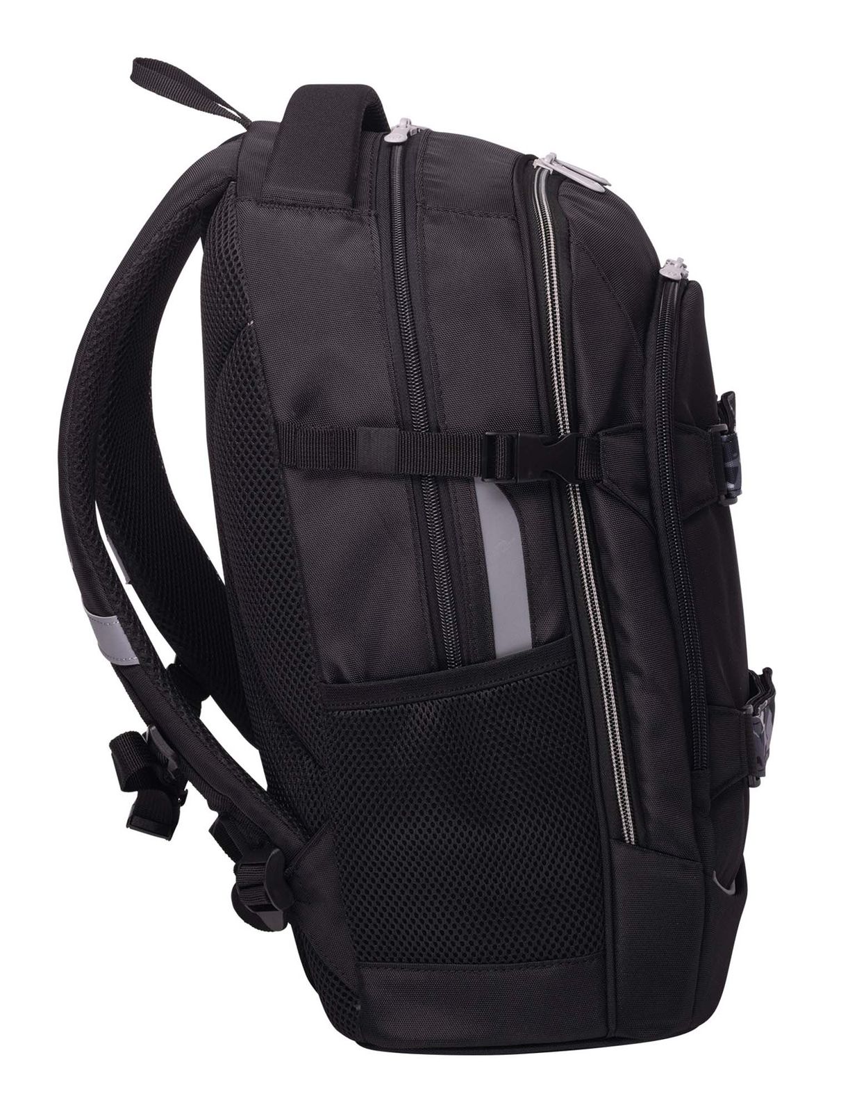 - On the right and left side 1 elastic slide-in compartment for water bottles or umbrellas and 1 infinitely adjustable compression straps with clip closure