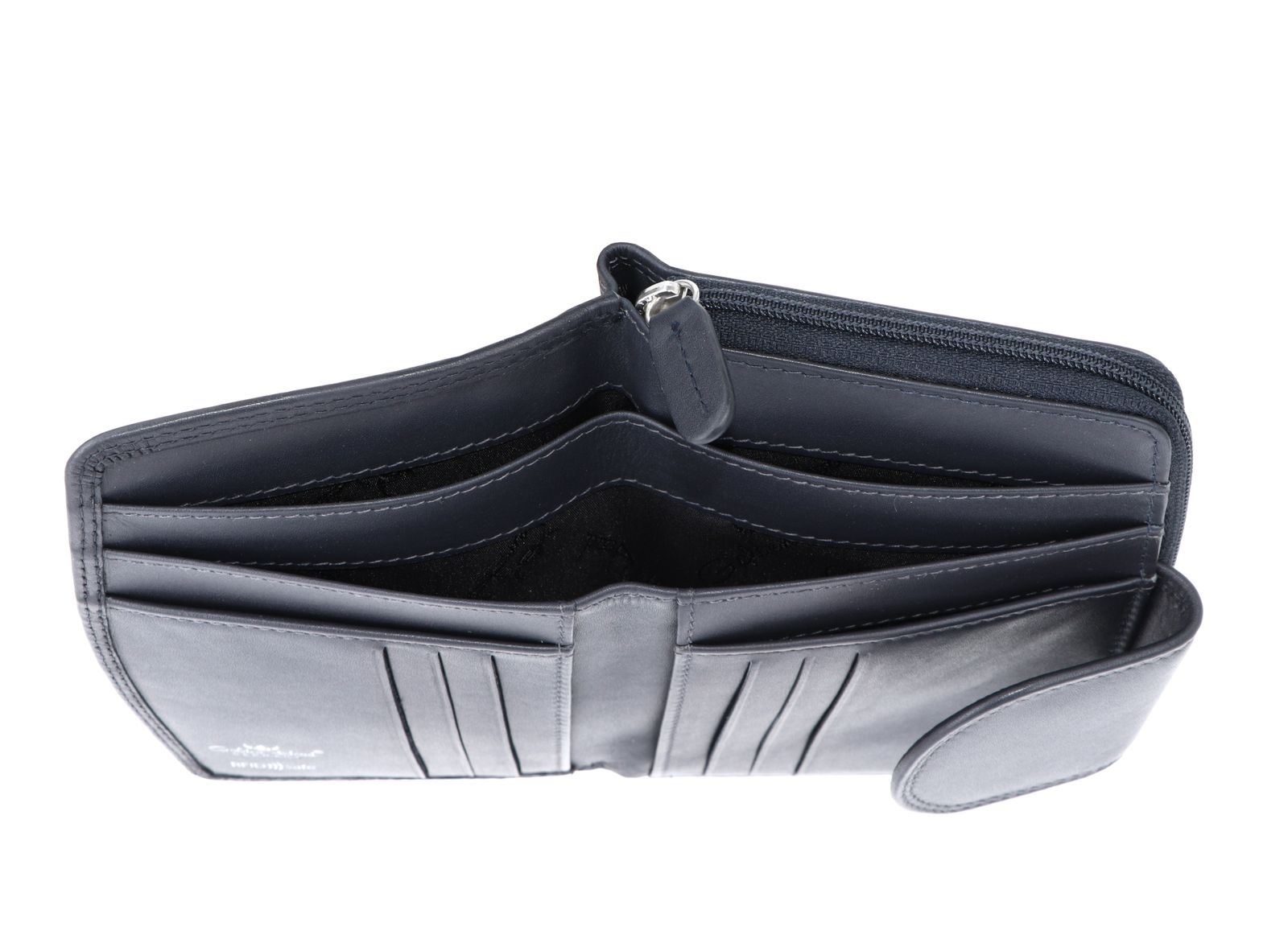 - Auf der Rückseite 1 Zipperfach für Münzgeld / Kleingeld, unterteilt in 2 Fächer, in dem sich 3 Fächer für Kreditkarten, EC Karten, Visitenkarten etc. und 2 Einschubfächer befinden