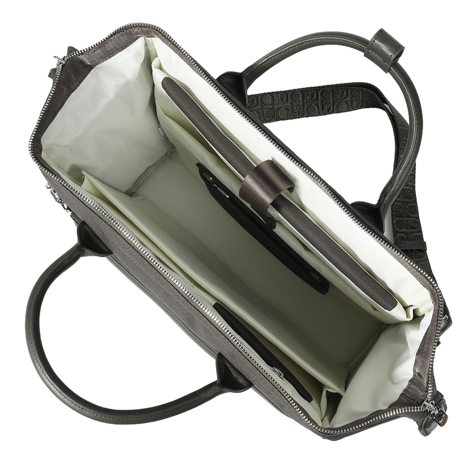 - Im Hauptfach 1 gepolstertes Tabletfach mit Lasche und Klettverschluss, 3 gepolsterte Einschubfächer, 2 Einschubfächer, 2 Befestigungsmöglichkeiten mit Druckknopf für Utensilientaschen und 1 Zipperfach