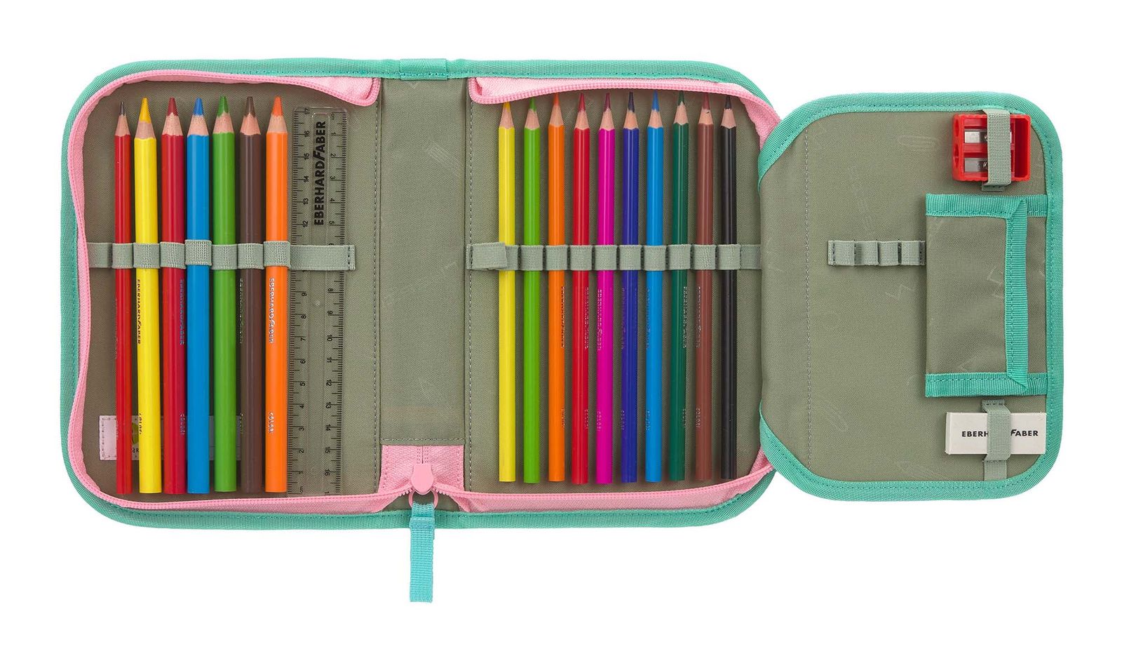 - Im Hauptfach 18 elastische Gummischlaufen für Stifte, 3 Gummischlaufen für Radiergummi, Lineal etc., 1 Namensschild, 1 Sichtfach für Stundenpläne und 1 angenähtes Täschchen mit Klettverschluss
