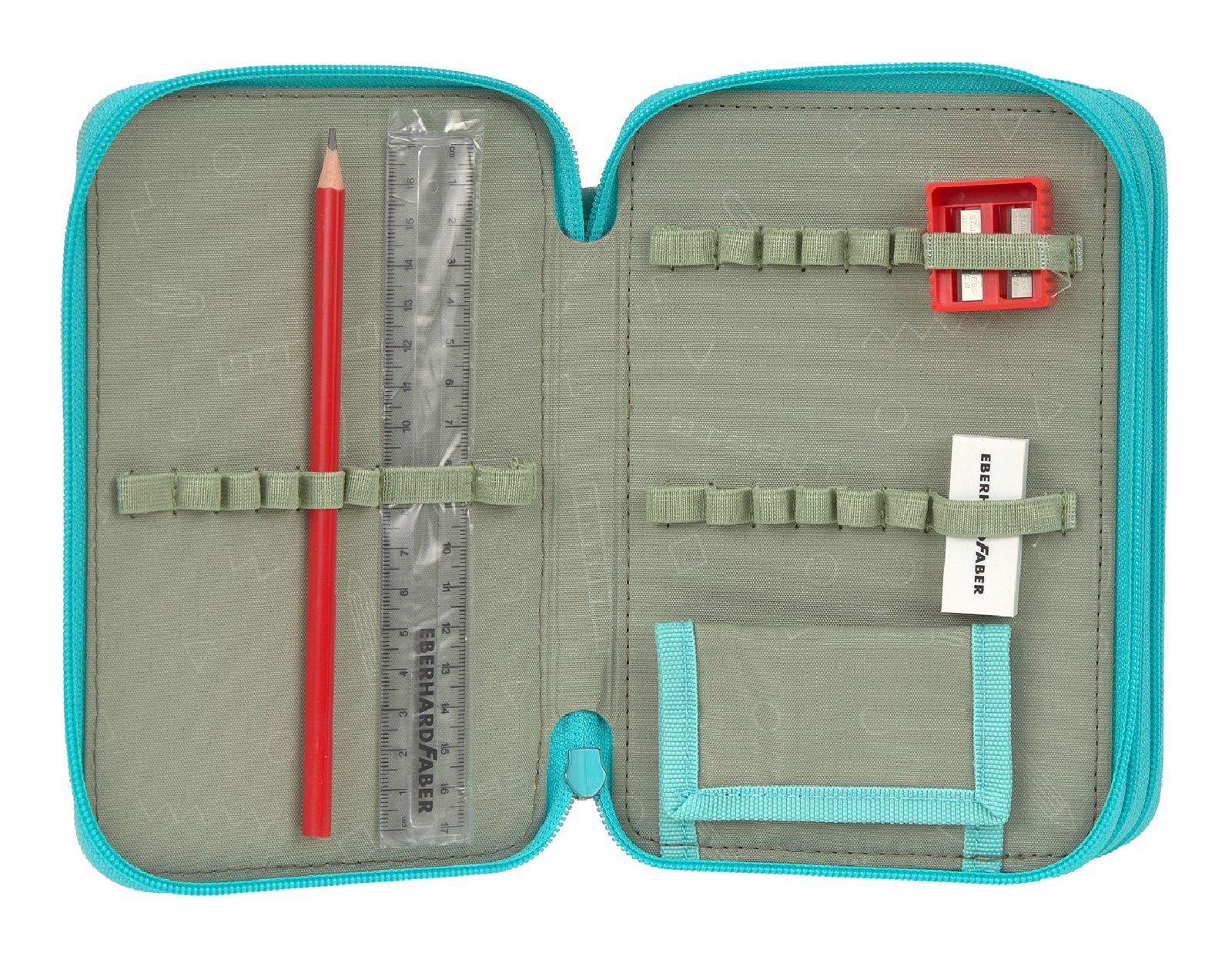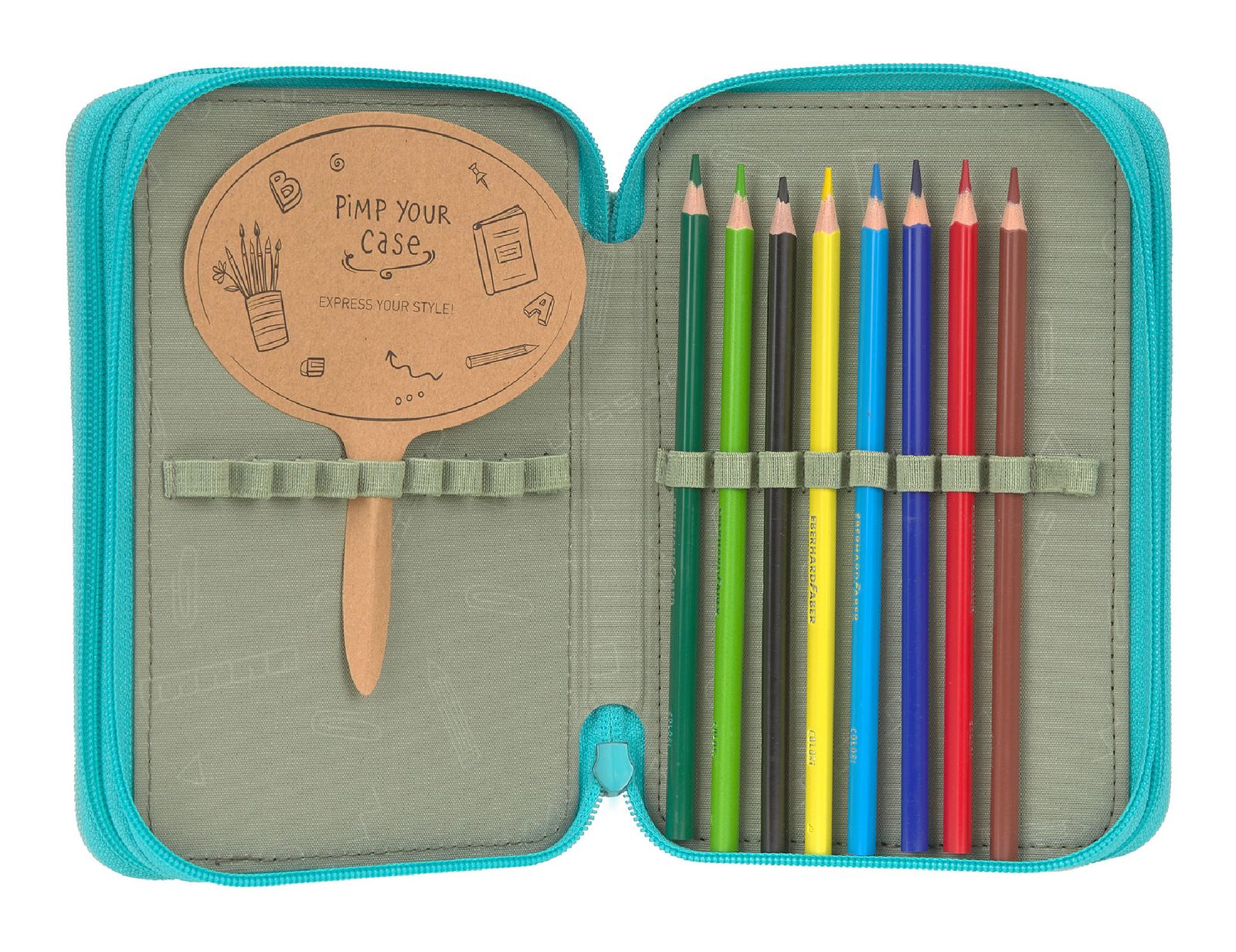 - Im hinteren Hauptfach 18 elastische Stiftehalter und 1 angenähtes Namensschild