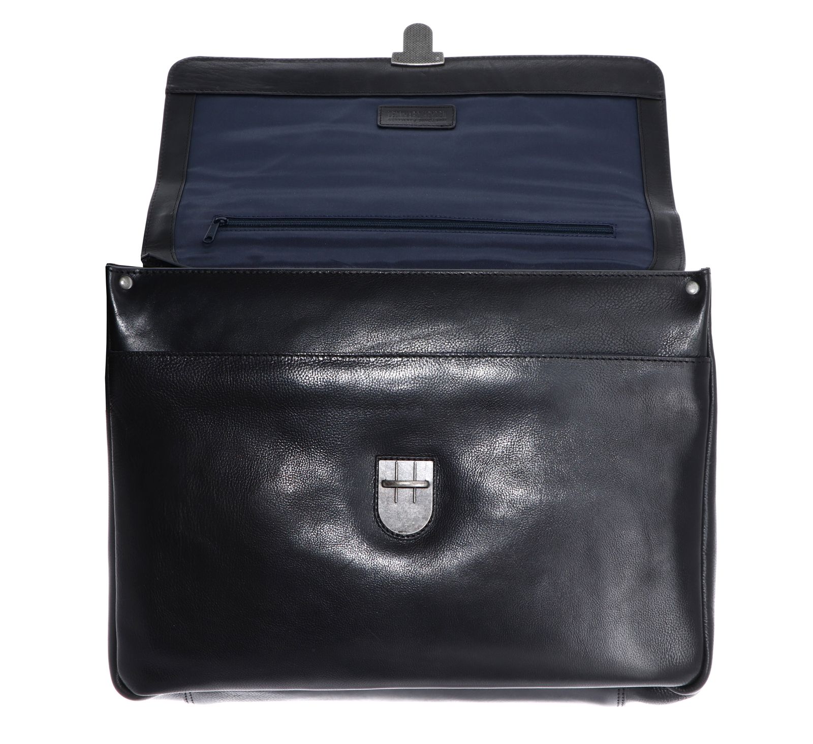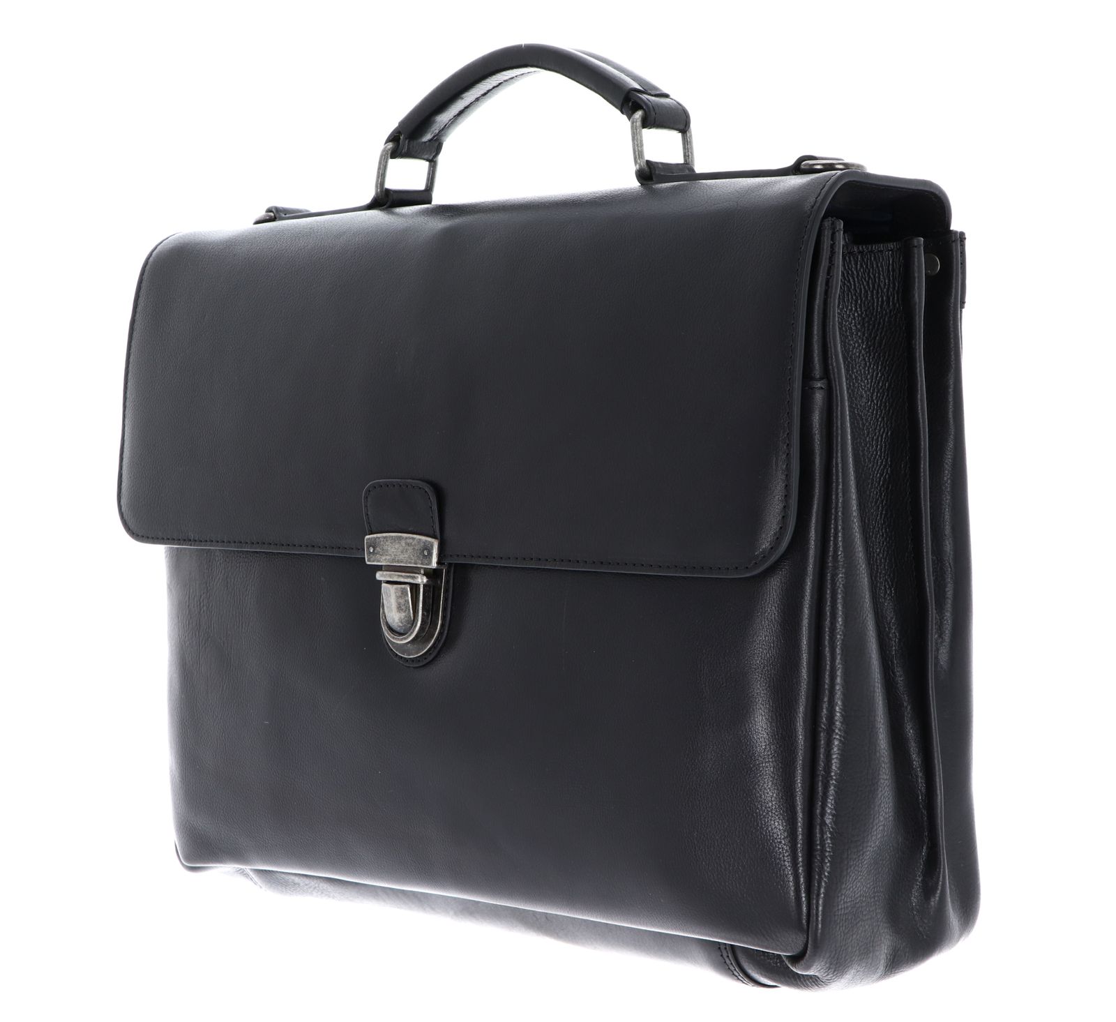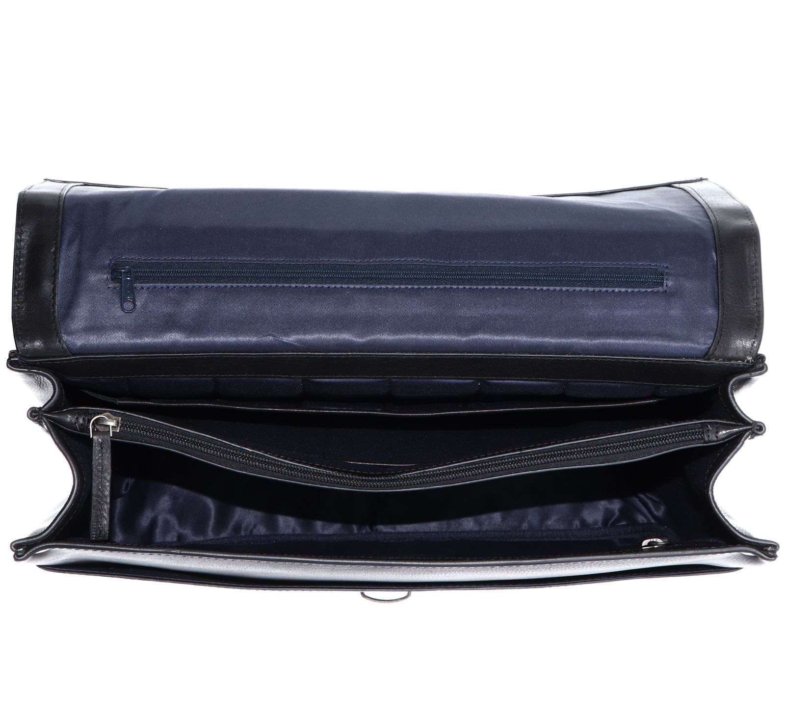 - Aktentasche wird mit Schnappverschluss und Überschlagklappe geschlossen