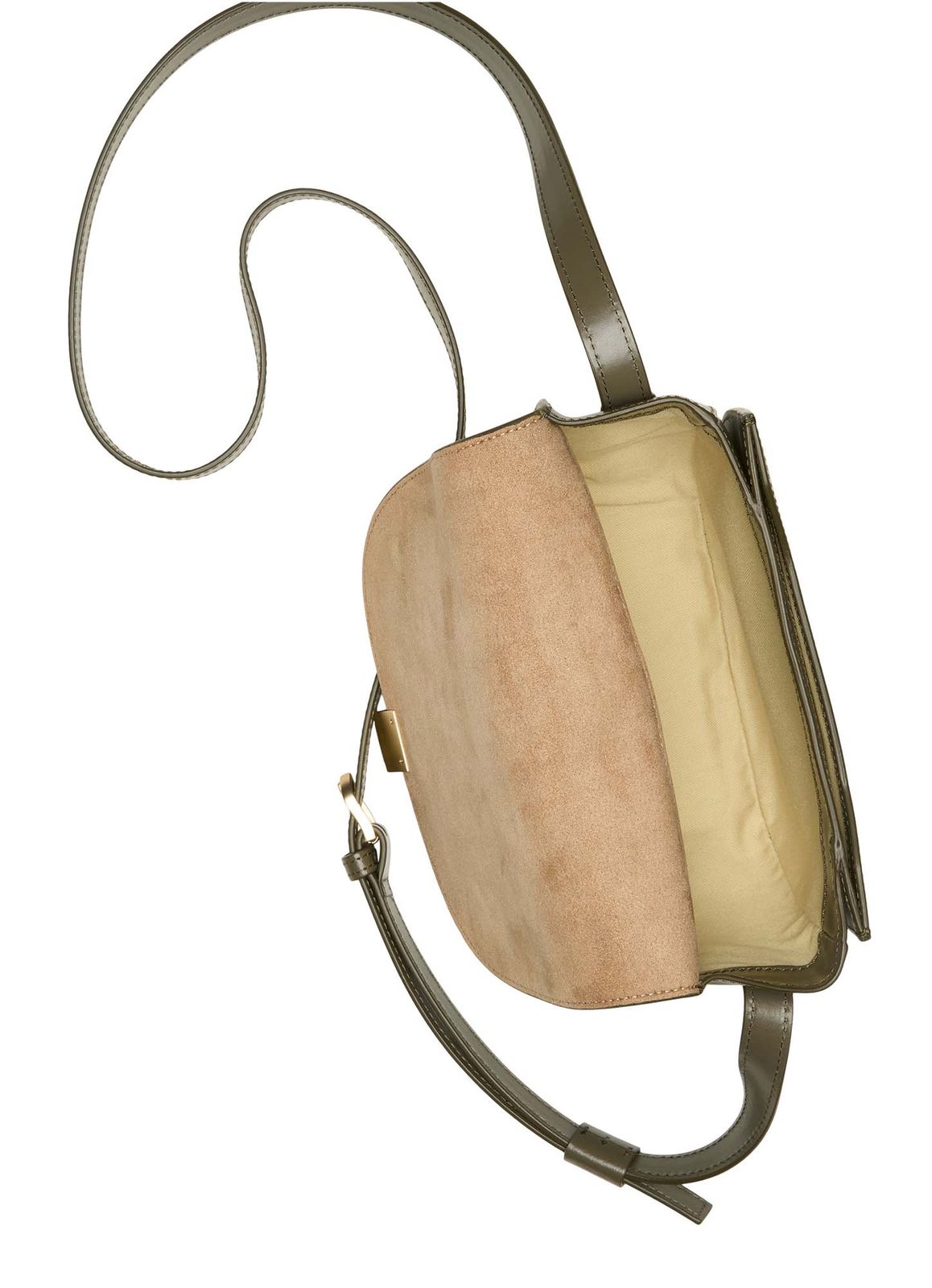 - Umhängetasche wird mit Überschlagklappe und Steckverschluss geschlossen