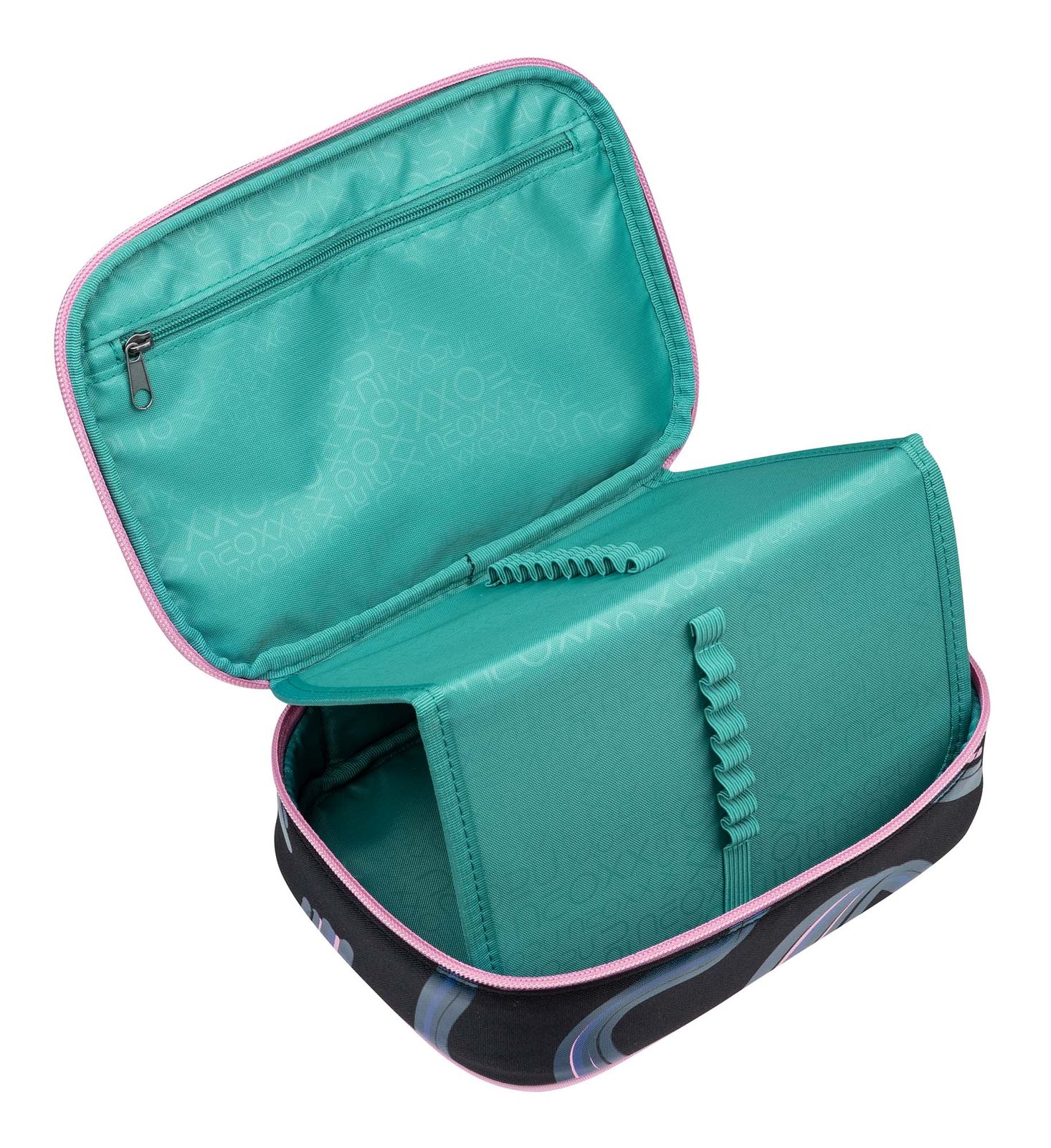 - Im Hauptfach 1 Zipperfach, 26 Gummischlaufen für Stifte, Lineal etc., 1 Gummischlaufe für Radiergummi, Lineal etc. und 1 Sichtfach für Stundenpläne