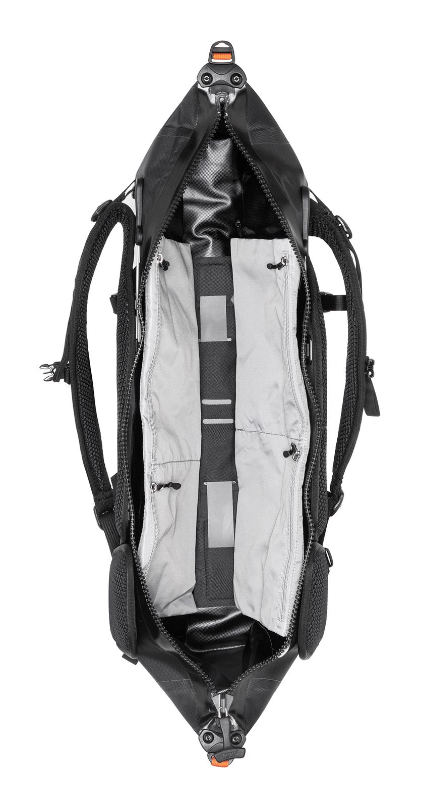 - Auf der Vorderseite 10 Befestigungsschlaufen, 1 Kompressionsriemen mit stufenlos verstellbar Schnalle und 4 Kompressionsriemen mit stufenlos verstellbarem Clipverschluss