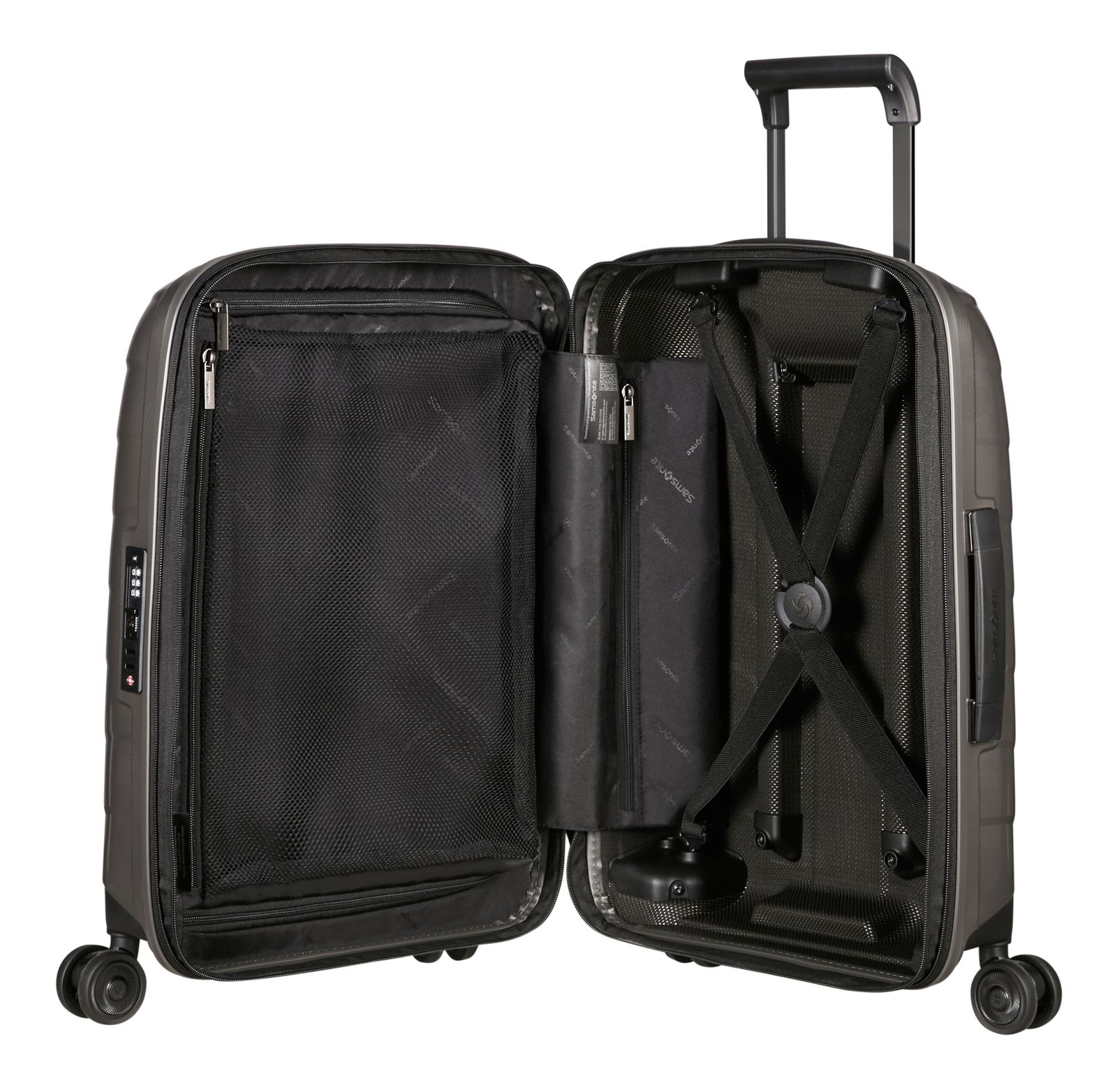 - Lieferumfang: Samsonite Trolley mit Etikett, 4 x Namensschild, 1 x Kompressionsriemen