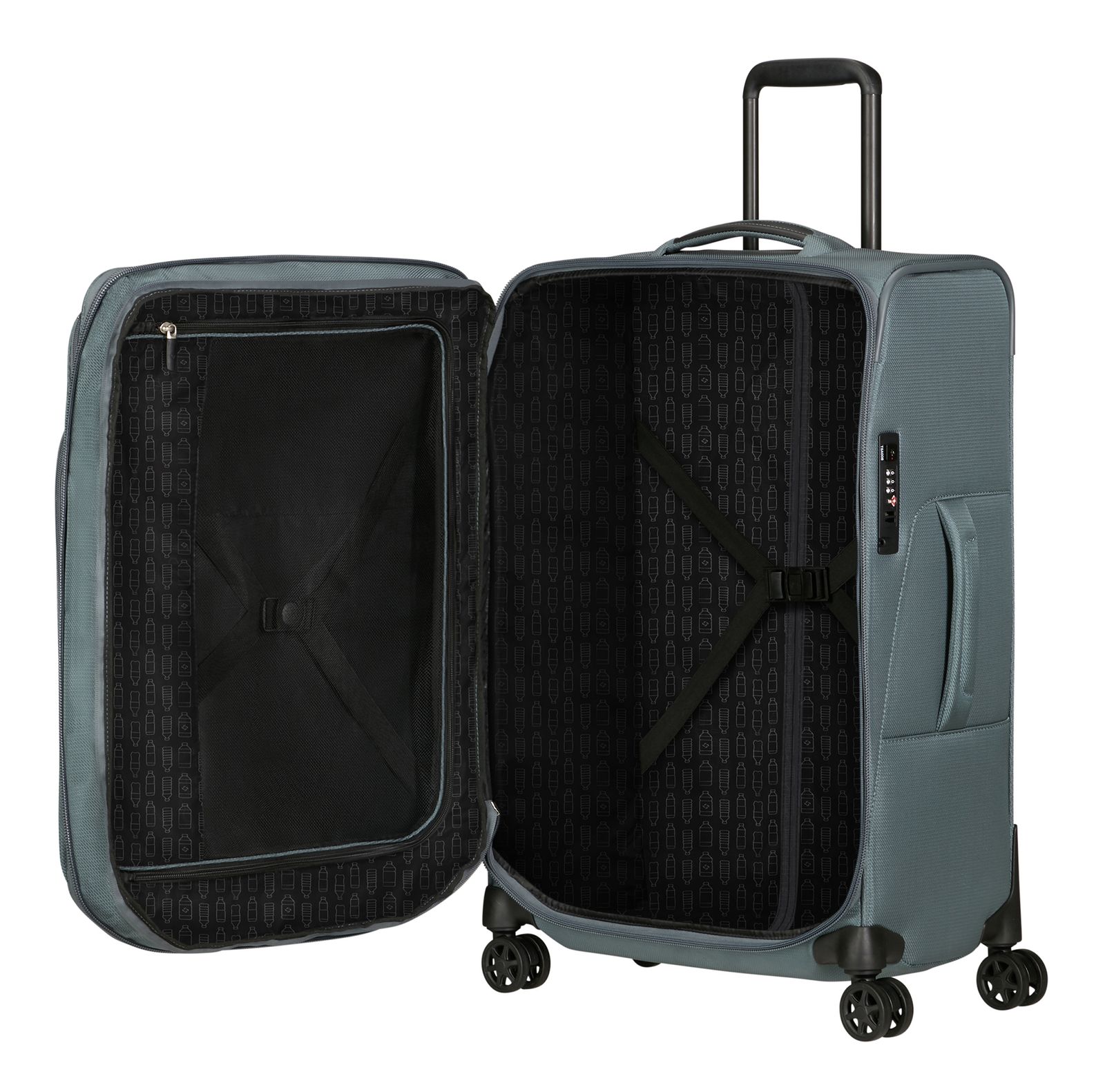 - Auf der Innenseite des Deckels 1 elastischer Kompressionsriemen mit Clipverschluss und 1 Trennwand mit Zipper