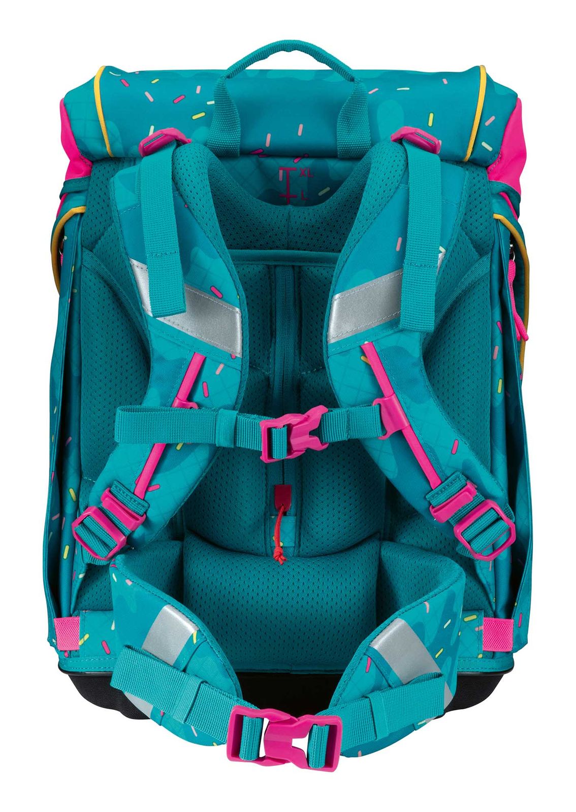 - Schulranzen wird mit Zugband, Überschlagklappe und Schnappverschluss geschlossen
