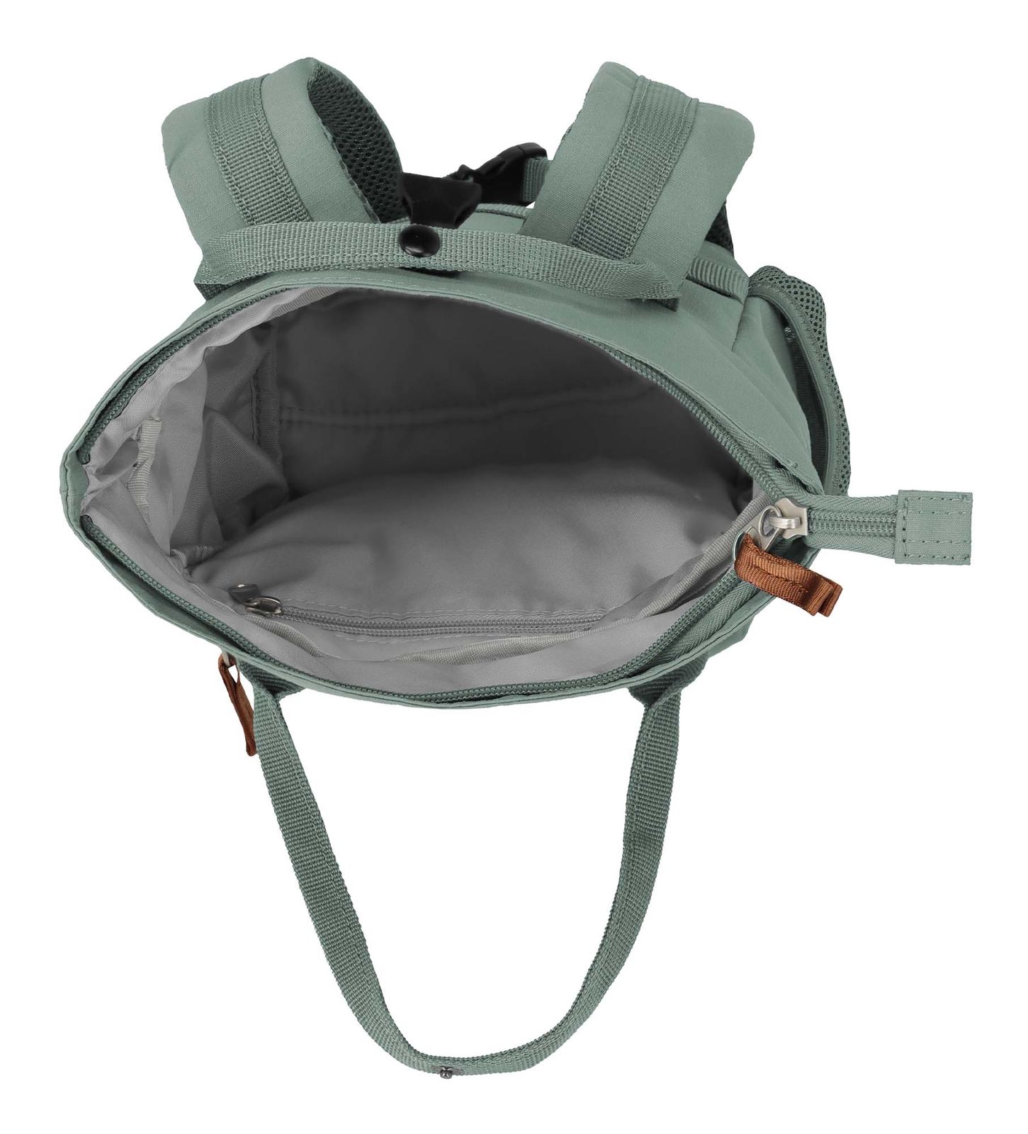- Rucksack wird mit Zipper, Rollverschluss und stufenlos verstellbarem Clipverschluss geschlossen